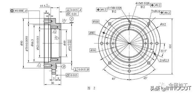 公司某型号产品中轴套类零件较多,零件精度也较高,如短空心轴(见图1)和解算器座(见图2),其尺寸精度为IT5~IT7,同轴度为φ0.008~φ0.015mm,垂直度为0.010~0.015mm。具有精度要求高、壁薄易变形的特点。