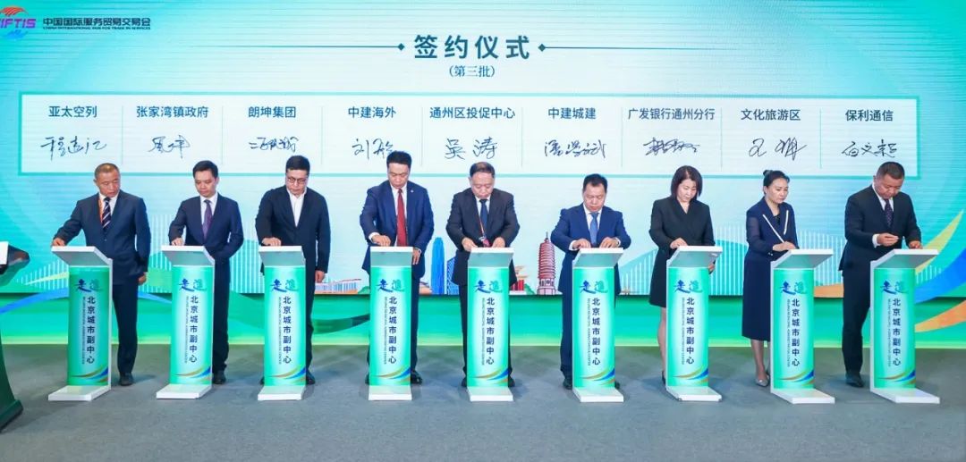 9月5日,在2023年中国国际服务贸易交易会“走进北京城市副中心”主题活动现场,中建城建公司与北京市通州区人民政府签署战略合作框架协议。北京市通州区投资促进服务中心主任吴涛与中建六局助理总经理、城建公司党委书记、董事长潘学斌代表双方签约,中建城建公司党委委员、副总经理齐伟出席签约仪式。