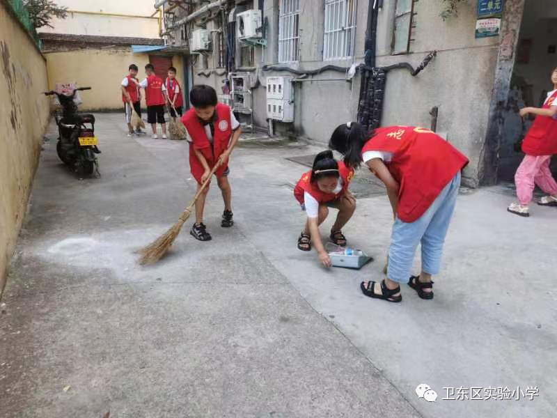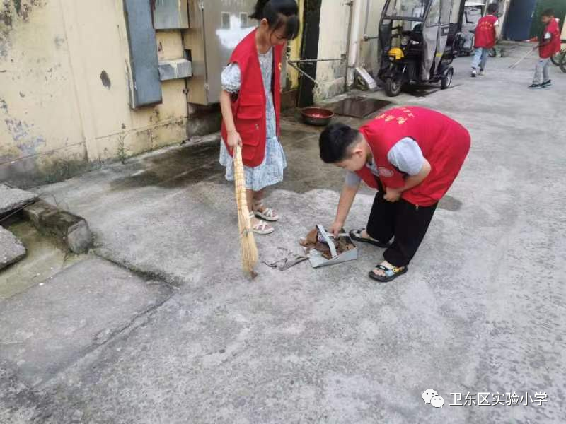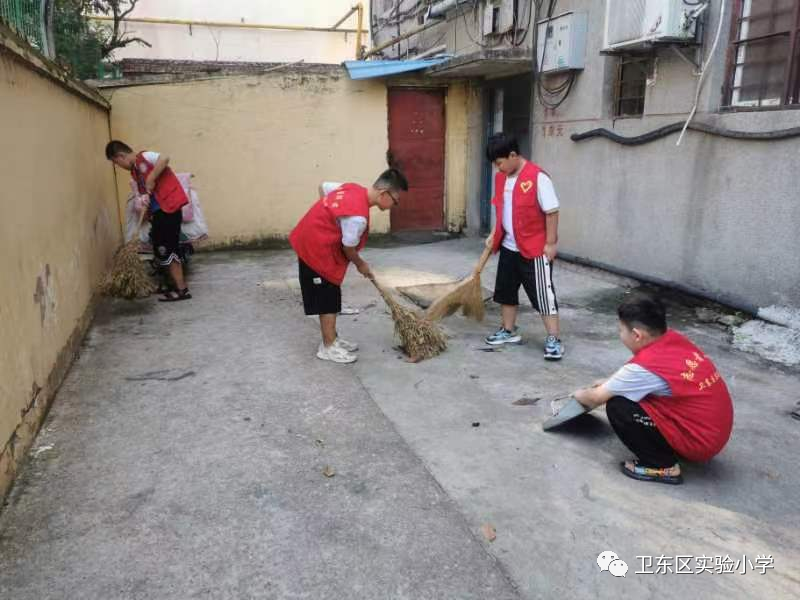 启动仪式结束后,卫东区实验小学“学雷锋小分队”就穿着志愿者服装,自带扫把、簸箕等工具来到海棠社区开展卫生清洁志愿者活动。