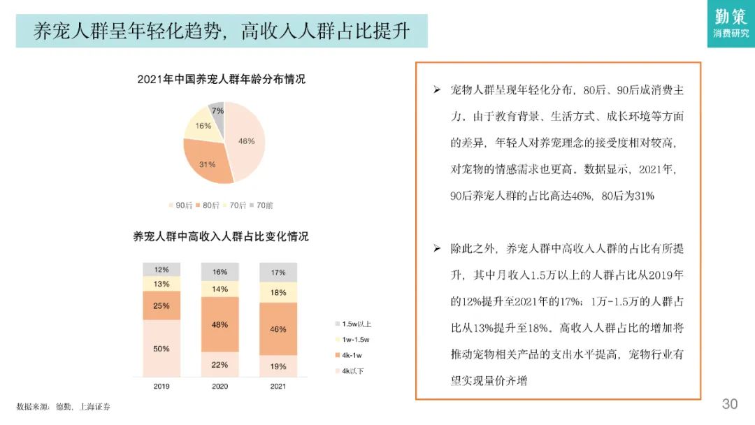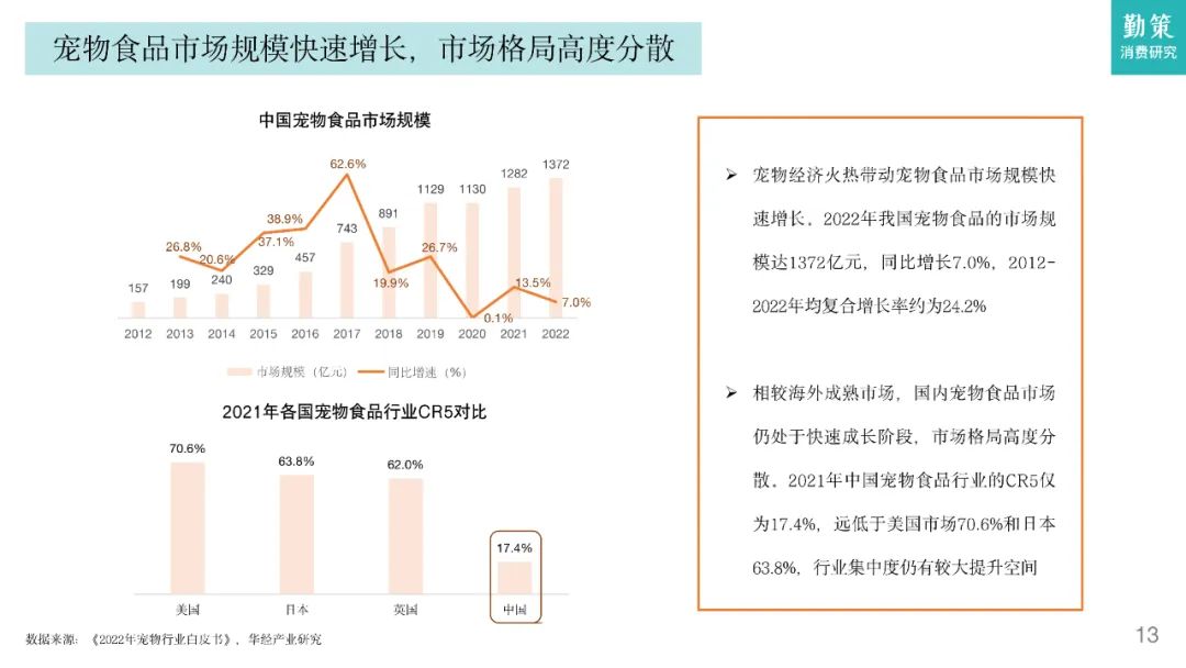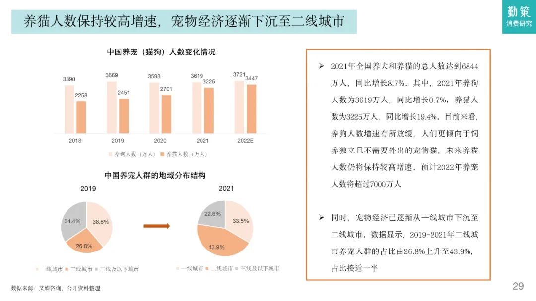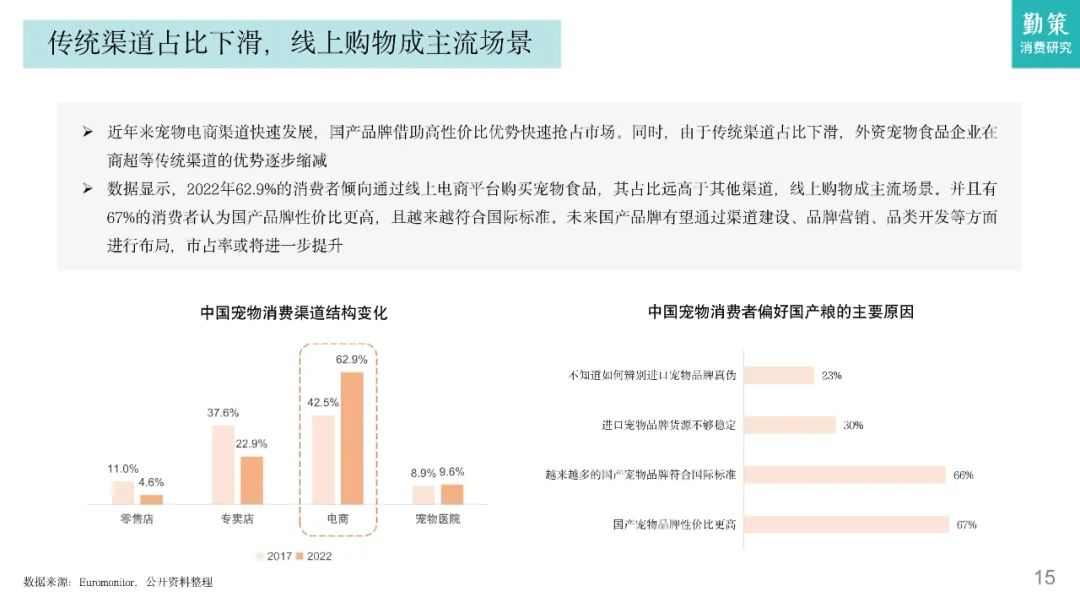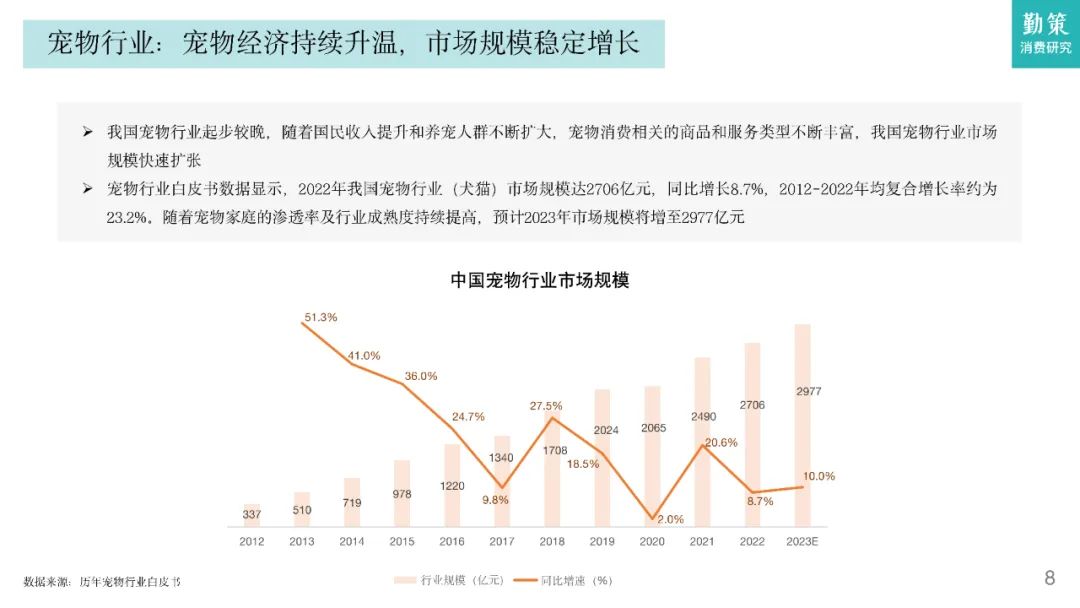 摘要:【勤策消费研究】2023中国宠物行业发展趋势报告-摘要近年来,中国宠物行业持续蓬勃发展,成为消费市场的一个热点。根据最新发布的《2023中国宠物行业发展趋势报告》,我们可以看到以下核心观点和数据。首先,宠物保健市场呈现井喷态势。报告指出,随着宠物饲养意识的提高和人们对宠物健康的关注增加,宠物保健品市场将迎来快速增长。据调研数据显示,去年中国宠物保健品市场规模达到150亿元人民币,预计未来三年将以年均15%的速度增长。其次,线上渠道成为宠物消费新趋势。报告显示,在移动互联网的推动下,线上渠道迅速崛起。购物平台、社交媒体以及宠物生活服务平台的发展,为消费者提供了更加便捷的购物体验和全方位的宠物服务。数据显示,2022年中国宠物线上消费额已超过200亿元,预计到2023年将达到400亿元。此外,宠物医疗市场呈现出爆发性增长。随着宠物数量的增加,宠物医疗行业也迎来了前所未有的机遇。报告指出,中国宠物医疗市场规模预计在2023年将达到80亿元人民币,其中,宠物保险市场将成为增长亮点。预计未来三年,中国宠物保险市场将以年均30%的速度增长。综上所述,2023中国宠物行业发展趋势报告显示了宠物保健市场的增长潜力、线上渠道的重要性以及宠物医疗市场的爆发性增长。这些数据和观点为行业从业者和投资者提供了有益的参考和发展方向。相信随着中国宠物行业的进一步发展,未来将会有更多的机遇和挑战等待着我们。(以上为摘要,报告详细内容请下载查阅)