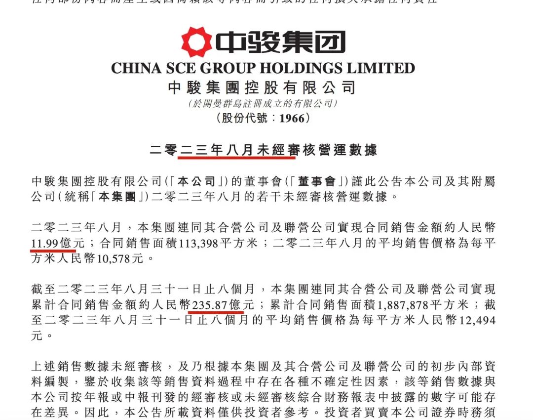 天天房产9月8日讯,中骏集团控股有限公司(简称:中骏集团控股,1966.HK)发布2023年8月未经审核运营数据。