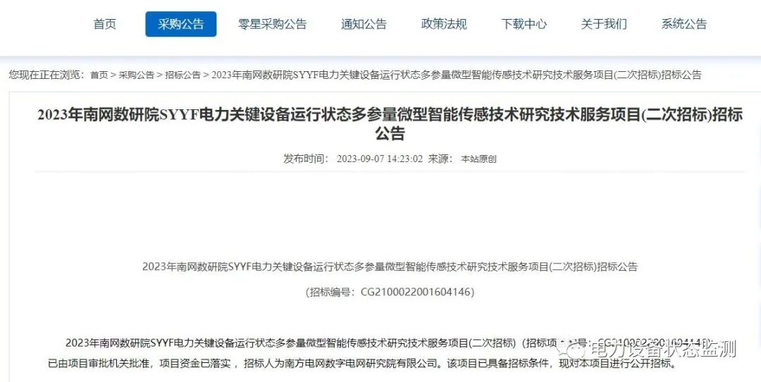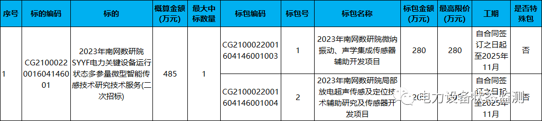 近期,南网数研院发布“2023年南网数研院SYYF电力关键设备运行状态多参量微型智能传感技术研究技术服务项目(二次招标)招标公告”,其中: