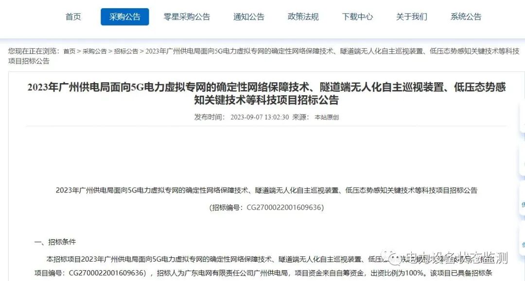 近期,广州供电局发布“2023年广州供电局面向5G电力虚拟专网的确定性网络保障技术、隧道端无人化自主巡视装置、低压态势感知关键技术等科技项目招标公告”,其中: