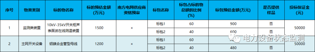 10kV-35kV开关柜声表面波在线测温装置标的预估金额1500万元;