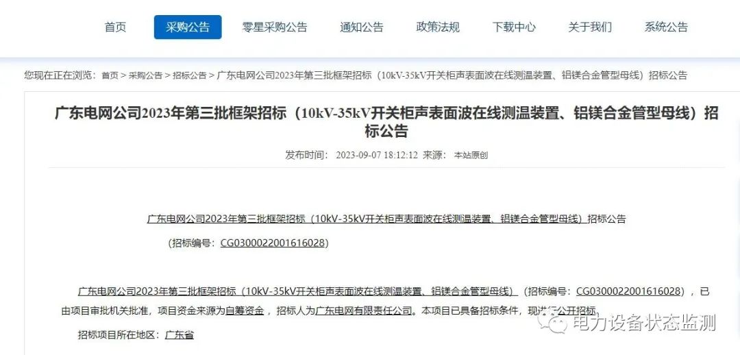 近期,广东电网公司发布“广东电网公司2023年第三批框架招标(10kV-35kV开关柜声表面波在线测温装置、铝镁合金管型母线)招标公告”,其中: