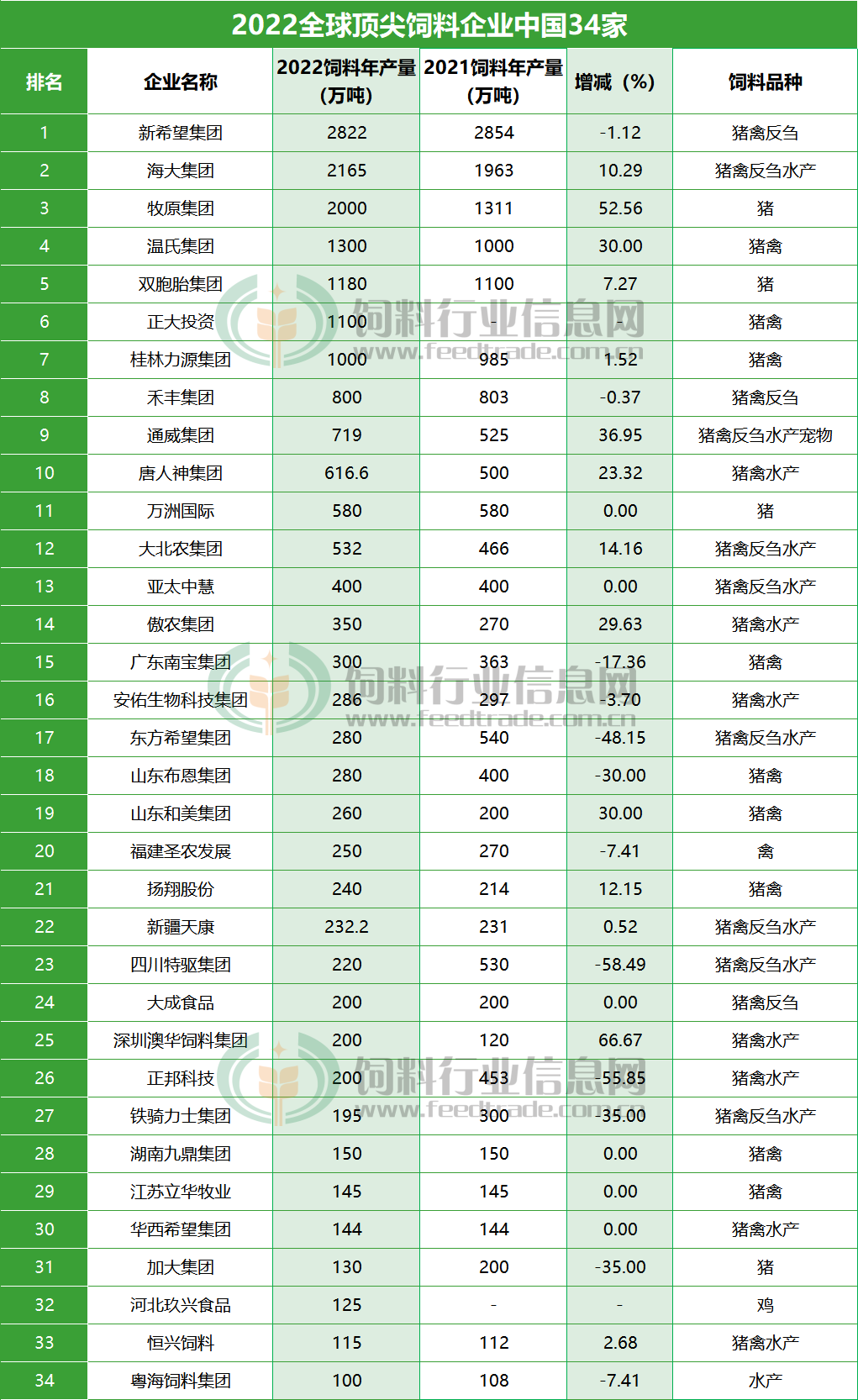 中国上榜企业34家,比2021年增加2家,分别是正大投资和河北玖兴食品;从WATT国际传媒统计的数据来看,中国共有7家企业饲料产量超1000万吨,新希望、海大和牧原饲料产量均超2000万吨,这三家也是全球饲料产量最大的企业;从增幅来看,澳华增幅最大,达66.67%,其次牧原也达到了52.56%,通威和温氏增幅也在30%以上;从降幅来看,最大的是特驱和正邦,降幅均超过一半,东方希望降幅也接近50%,布恩集团、铁骑力士集团以及加大集团降幅也超过了30%。