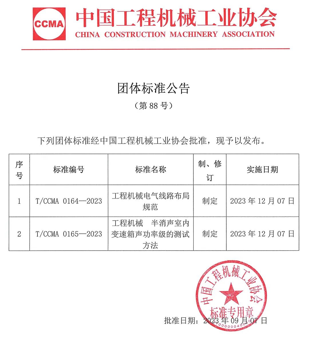 中国工程机械工业协会团体标准公告(第88号)