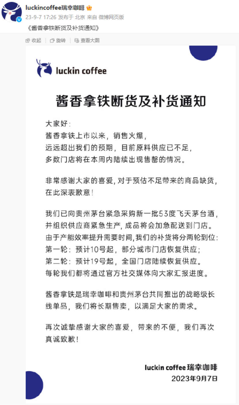 酱香拿铁有多火?直接卖断货了!9月7日下午,瑞幸咖啡官方微博发布酱香拿铁断货及补货通知。通知指出,目前原料供应已不足,多数门店将在本周内陆续出现酱香拿铁售罄的情况。瑞幸咖啡已向贵州茅台紧急采购新一批53度飞天茅台酒,并组织供应商紧急生产,成品将会加急配送到门店。