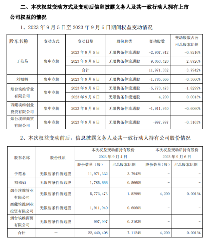 根据我乐家居披露的信息,9月5日,于范易通过竞价交易减持290.79万股,减持比例0.9216%,未触及信息披露义务;9月6日,于范易、刘福娟、埃维管业、埃维创投、埃维商贸分别通过集中竞价减持905.34万股、178.57万股、120万股、30万股、52.7万股公司股份。上述股东股份累计变动数量已达到公司总股本的5%(即1577.56万股),但相关股东未按照规定及时停止交易。同日,于范易、埃维管业、埃维创投、埃维商贸继续减持其持有的全部剩余股份,合计666.48万股,占公司总股本的2.11%。此外,埃维管业通过集中竞价方式买入4200股。