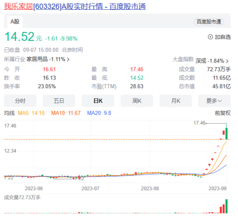 二级市场上,我乐家居在8月28日至9月6日期间,连续8个交易日涨停。9月7日早盘一度涨近8%,下午收盘时跌停,全天成交额超11亿元,换手率达到23%。