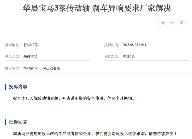 榜单中,宝马3系、宝马5系、宝马X3也被投诉至榜单第4、11和22名,原因是“传动轴异响;制动系统异响”;“传动轴异响;与宣传不符”;“与宣传不符;传动轴异响”。其中有宝马3系车主称,提车才几天就出现传动轴异响,4S店说不影响安全使用,等两个月换轴。