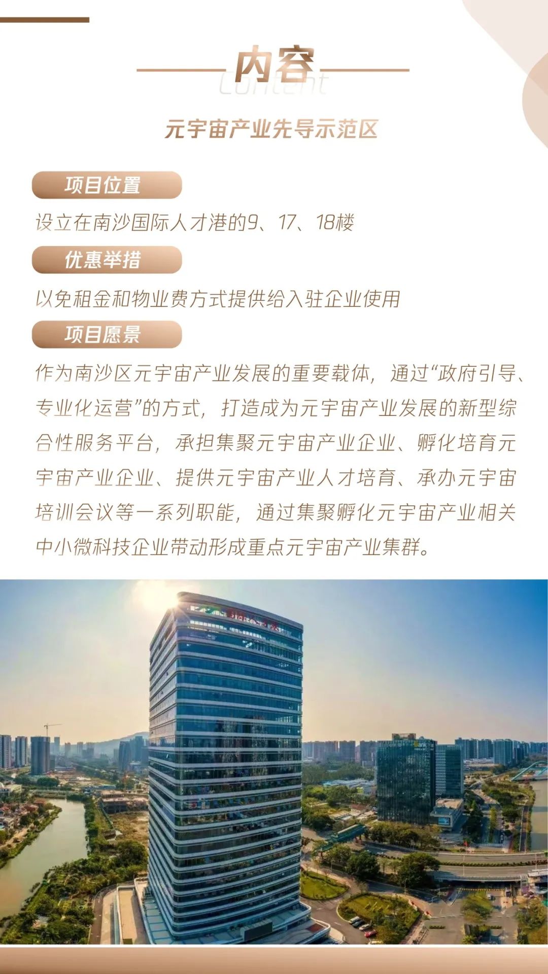 为贯彻落实《国务院关于印发广州南沙深化面向世界的粤港澳全面合作总体方案的通知》,促进元宇宙相关产业在南沙集聚发展,根据南沙区委区政府研究提出的包含“做实一个元宇宙创新联盟、规划一个元宇宙产业集聚区”在内的“八个一”举措,南沙区在国际人才港选取9、17、18楼作为元宇宙产业先导示范区,以免租金和物业费方式提供给元宇宙产业相关企业进驻使用。现发布入驻申请要求及相关政策表格,请申请企业按附件内容提交报送。具体要求如下: