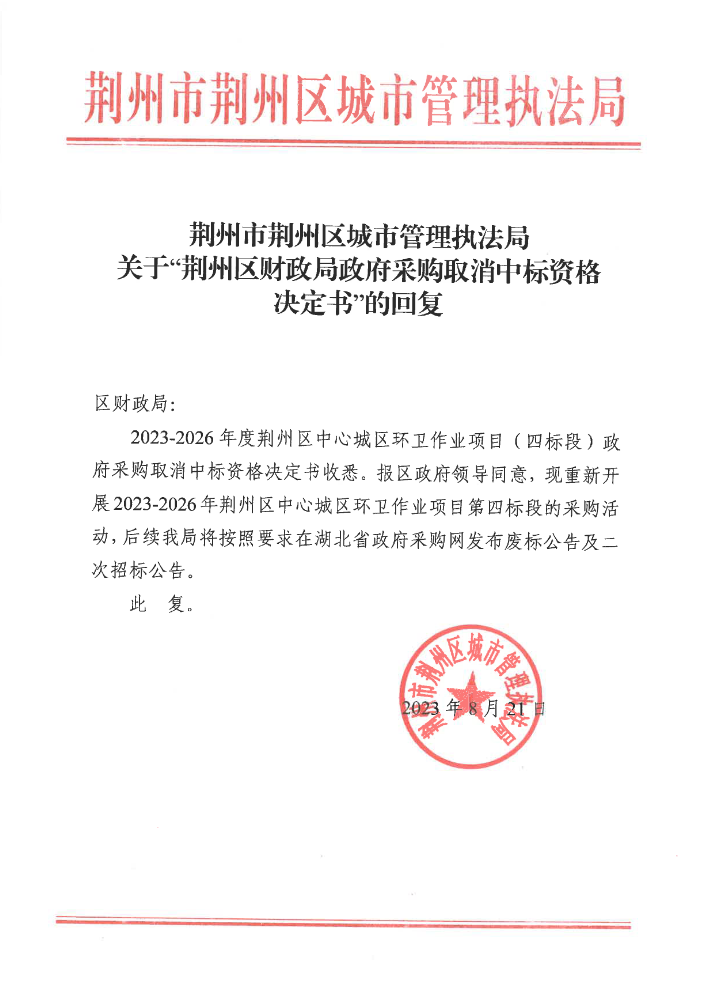 根据荆州市荆州区财政局“荆州区财政局政府采购取消中标资格决定书”取消湖北顺峰源环境工程服务有限公司参与的2023-2026年荆州区中心城区环卫作业项目第四标段的中标资格。