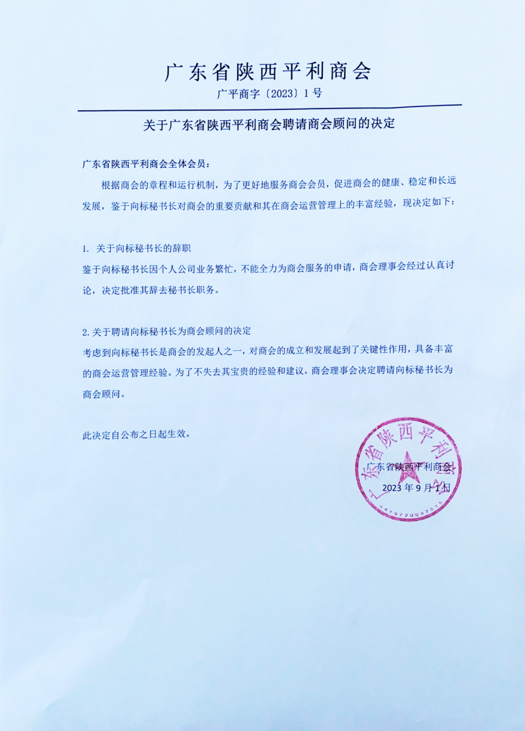 2023年9月1日,广东省陕西平利商会召开领导层会议,会议决定以下两个人事任命。