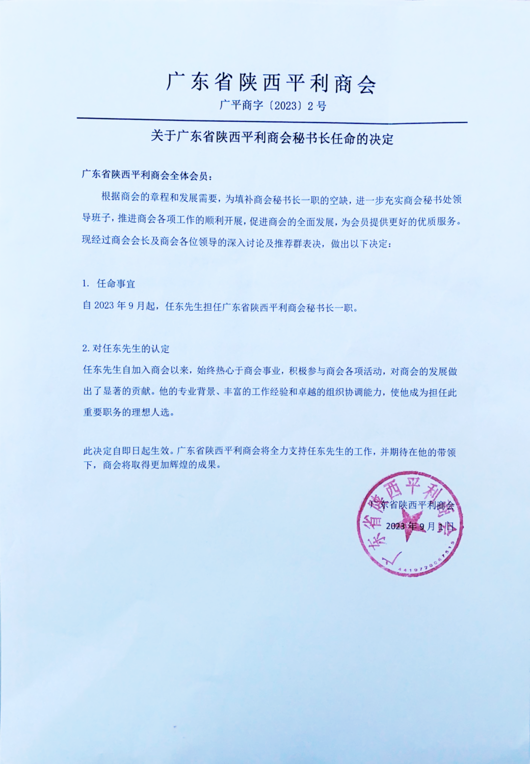一、任命任东为广东省陕西平利商会秘书长。