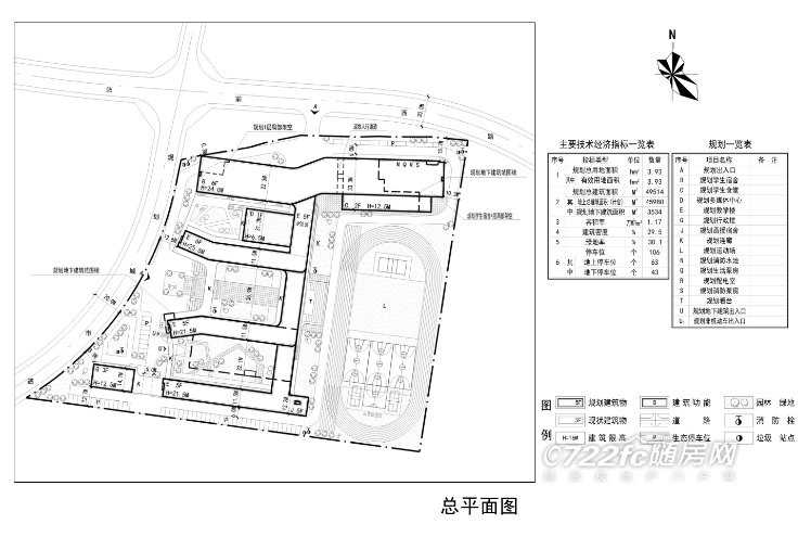 六、规划说明:规划结合场地合理布置学生宿舍、学生食堂、教学楼、行政楼、函授宿舍等功能建筑。在地块东侧布置运动场。
