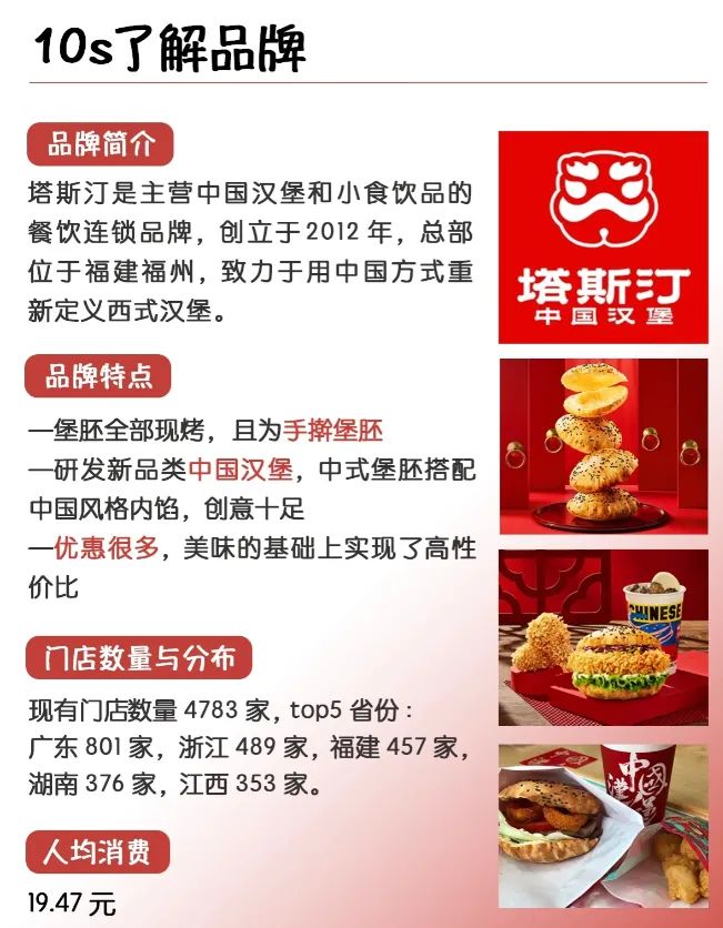 塔斯汀是主营中国汉堡和小食饮品的餐饮连锁品牌,创立于2012年,总部位于福建福州,致力于用中国方式重新定义西式汉堡。现有门店4783家,人均19.47。