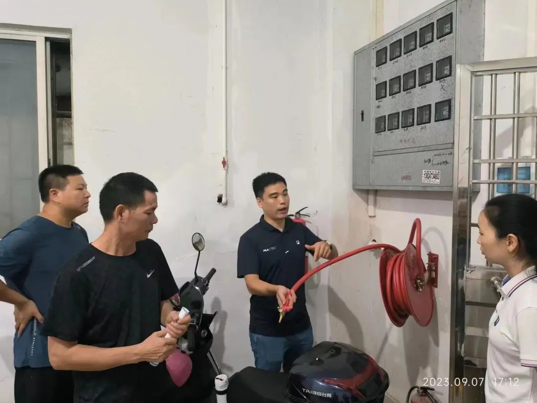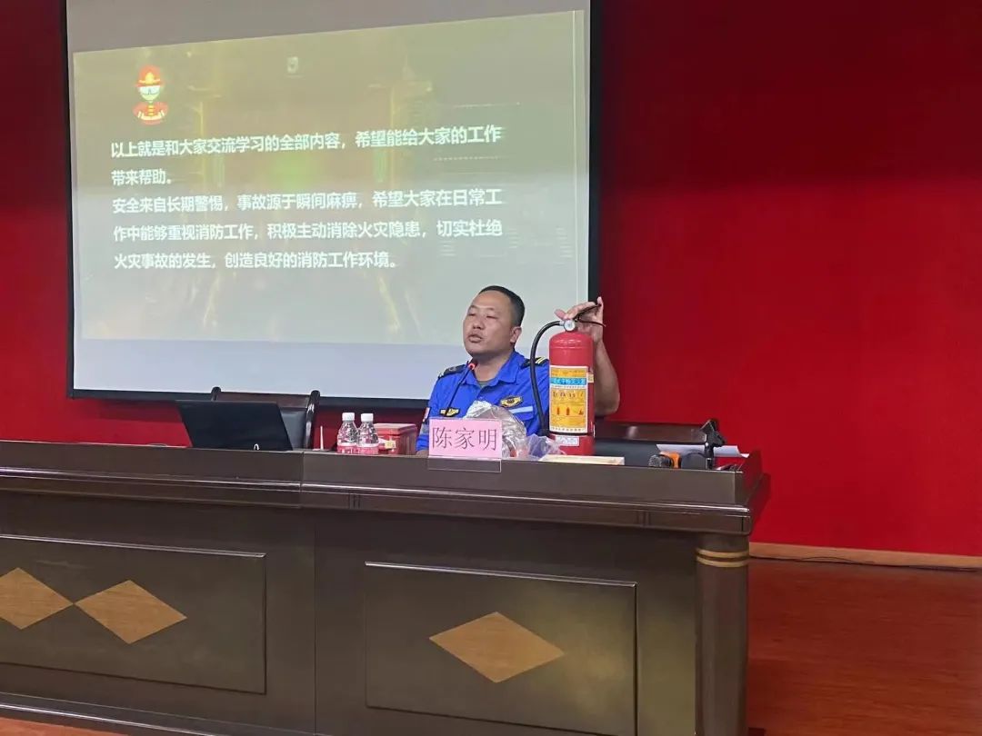 会上,首先由中山市消防救援支队聘请的居安消防服务公司培训讲师陈家明作培训授课。会议通过播放古镇“5.23”火灾事故和全国“三合一”亡人火灾事件及违规作业动火的火灾案件等一系列的伤人亡人警示教育视频,为全体参会人员敲响了警钟。陈家明通过火灾基本概念、经典案例分析、消防安全责任、常见火灾隐患四个方面,细致讲解了排查方法及应急自救技能,确保参会人员真正了解掌握消防安全基础知识。陈家明向参会人员演示灭火器正确使用方法,再让参会人员亲自操作,以实操形式加深参会人员对灭火器使用要领的理解。同时,讲解其他消防设施的使用方法和使用注意事项。