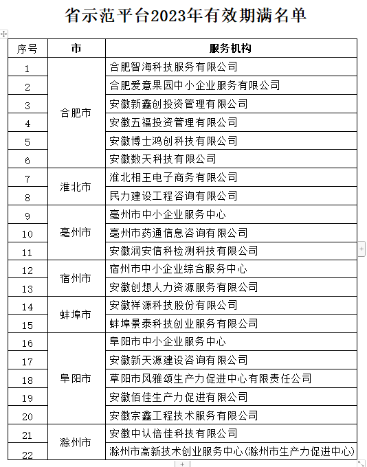根据《安徽省中小企业公共服务示范平台认定管理办法》(皖经信企发〔2020〕45号,以下简称《管理办法》),现就组织推荐2023年度安徽省中小企业公共服务示范平台(以下简称省示范平台)有关事项通知如下: