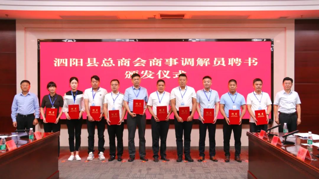 县工商联负责人宣读了《泗阳县总商会关于聘请泗阳县总商会商会商事调解员的决定》,县政协副主席、工商联主席王颢和县法院党组副书记、副院长崔亮共同为2023年度新任命的商会商事调解员颁发了聘书和工作证。