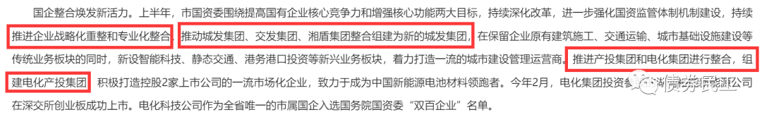 【温馨提示】因微信对公众号推荐顺序改版,不对公众号进行星标的话,亲爱的读者可能很久都收不到债券民工的更新推送,文章封面也看不看到。所以,重要的话提示三遍:星标、星标、星标! 根据湘潭市人民政府于2023年8月11日披露的信息《上半年市属国企经济平稳向好》,明确湘潭市国资委在2023年上半年推动“城发集团、交发集团、湘盾集团整合组建为新的城发集团”、推进“产投集团和电化集团进行整合,组建电化产投集团”。
