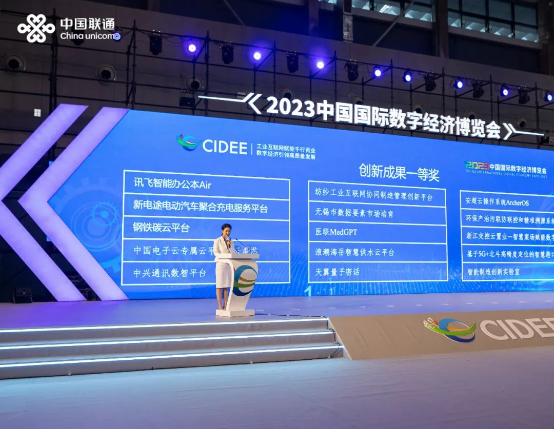 9月7日,2023中国国际数字经济博览会举办数字经济创新成果暨系列大赛颁奖典礼,中国联通有两项成果获奖。