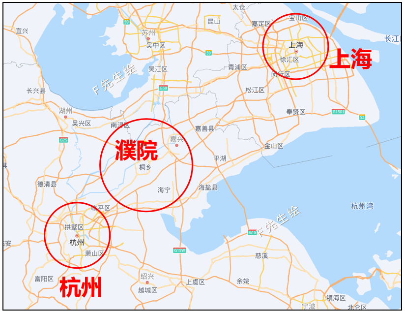 没去过的小伙伴可能会搞不清楚具体位置,我做了个图标注的濮院的方位,大致位于杭州和上海之间,离杭州更近: