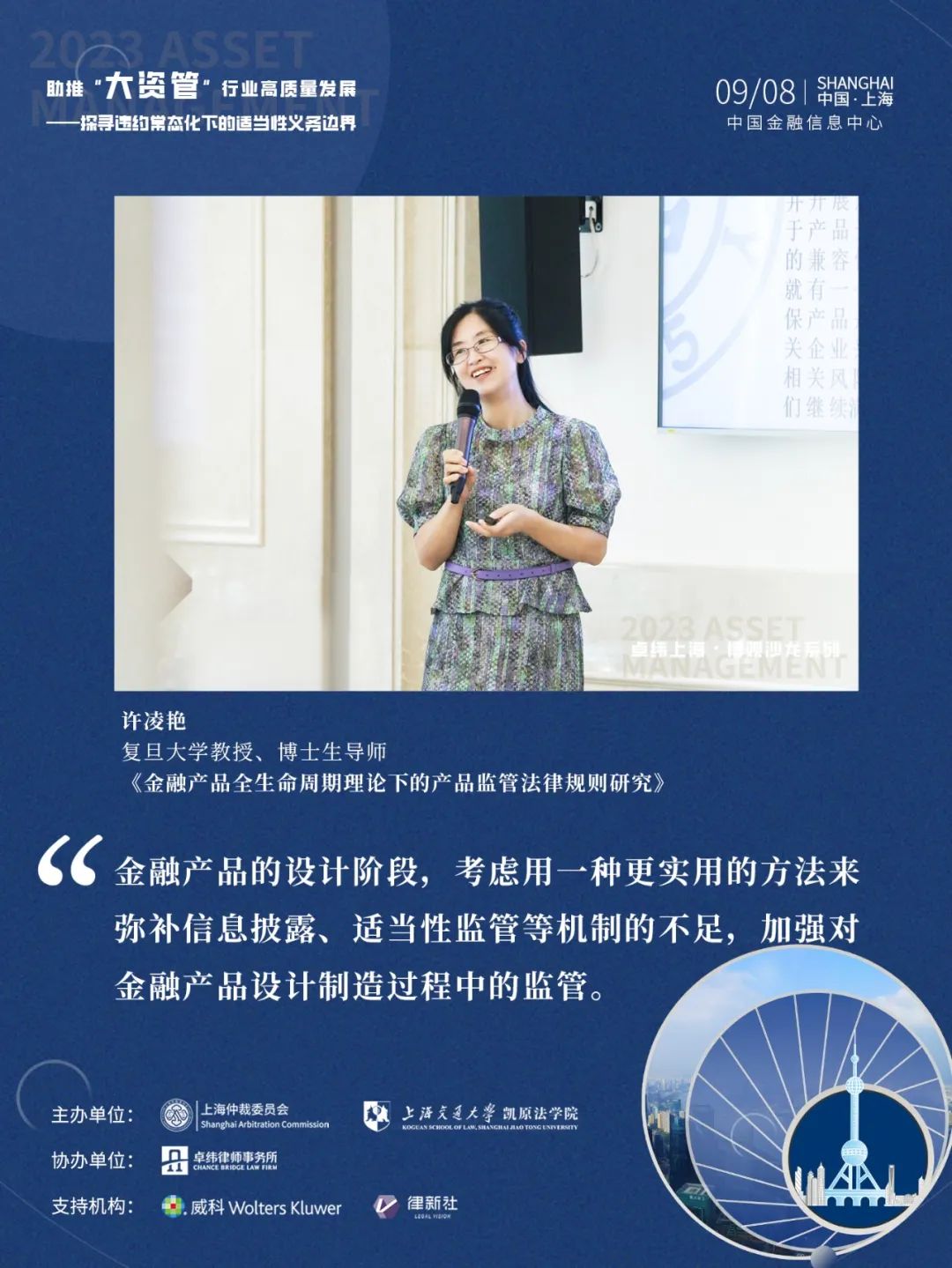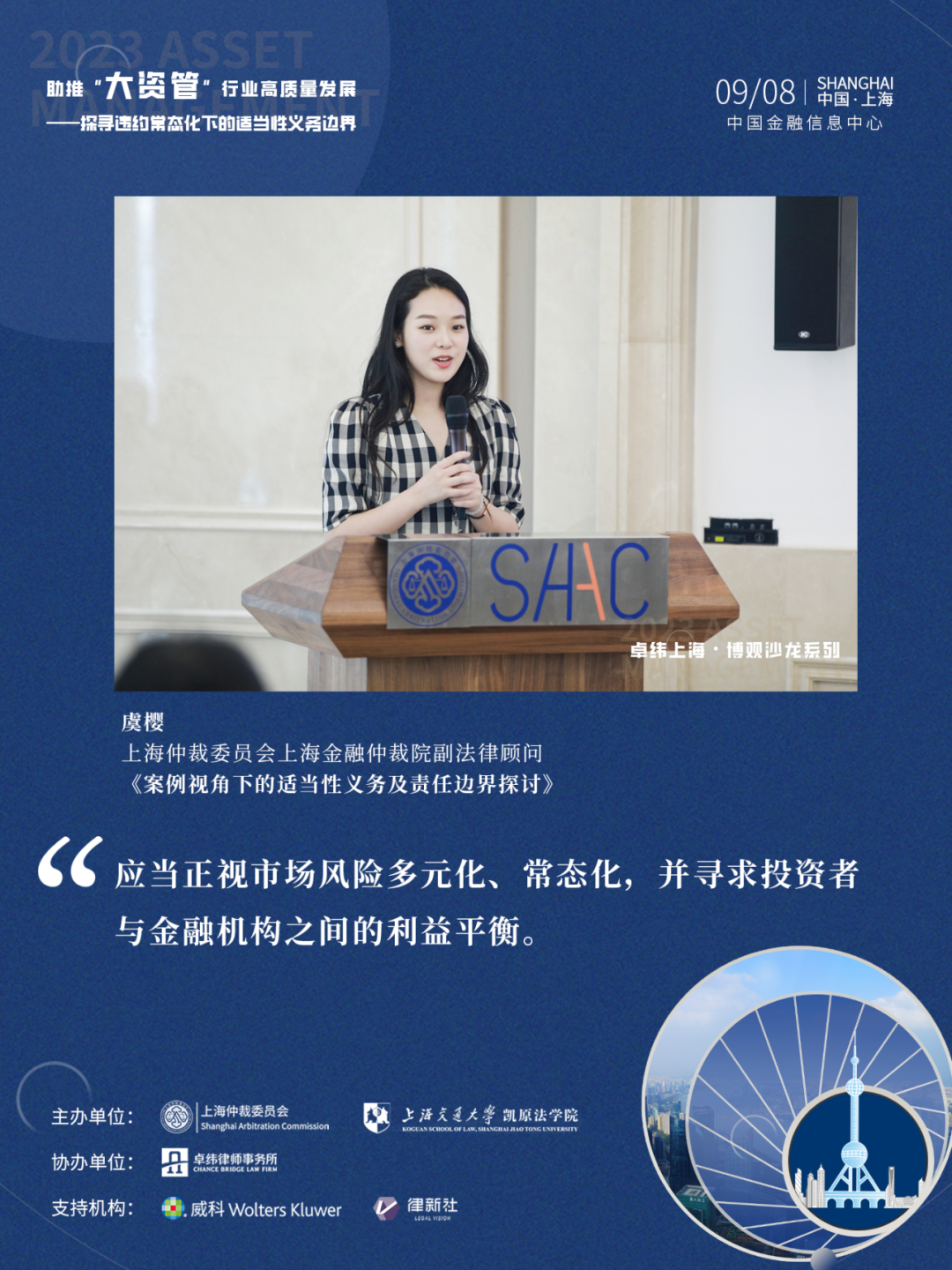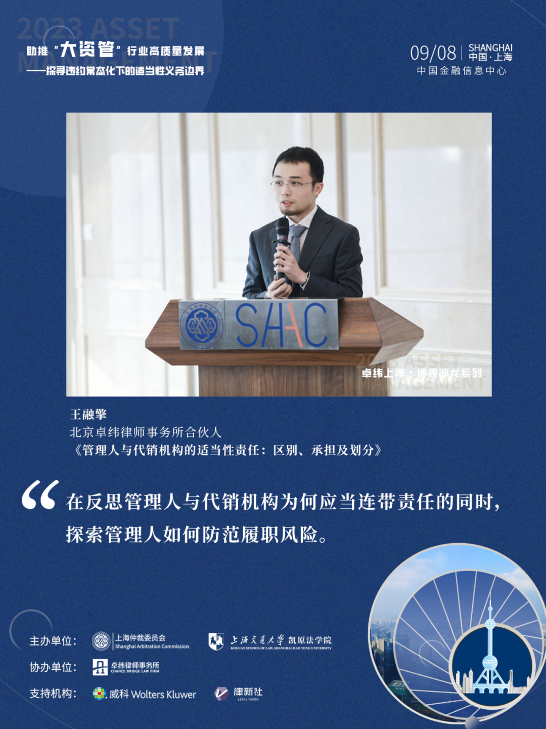 2023年9月8日,由上海仲裁委员会、上海交通大学凯原法学院联合主办,北京卓纬(上海)律师事务所(“卓纬”)协办,威科先行、律新社共同支持的助推“大资管”行业高质量发展——探寻违约常态化下的适当性义务边界研讨会在上海中国金融信息中心圆满举办。