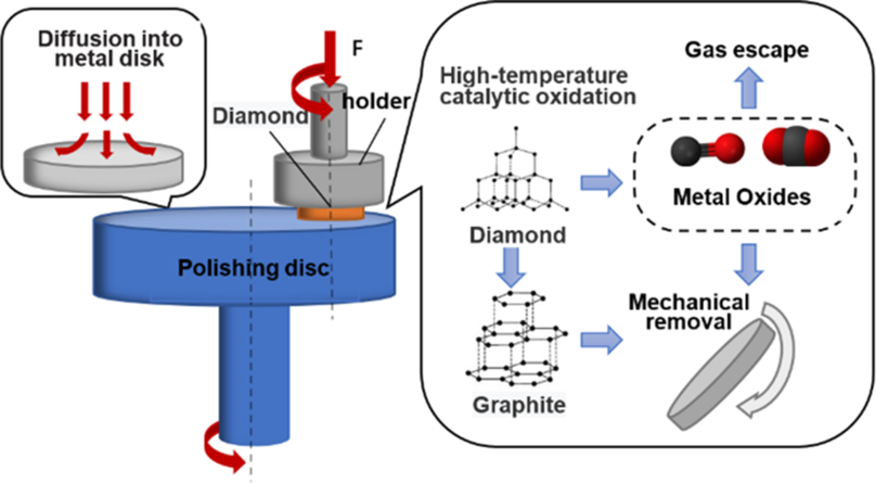 动态摩擦抛光的基本原理是通过将磨粒粘结在弹性材料上,然后将这些磨粒高速运动到工件表面上,从而产生摩擦热和局部压力。这些磨粒的运动可以在高速下进行,以实现高效抛光。,利用由金刚石和金属盘之间的动摩擦引起的热化学反应,通过以预定压力将金刚石复合体压到高速旋转的金属盘上以产生动摩擦来抛光金刚石复合体。