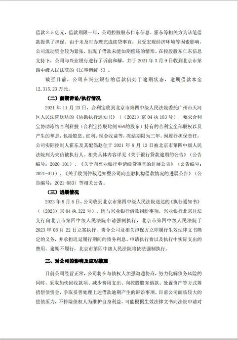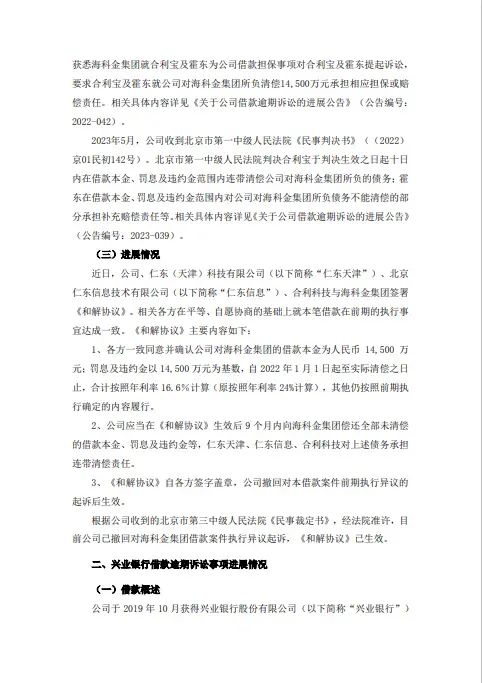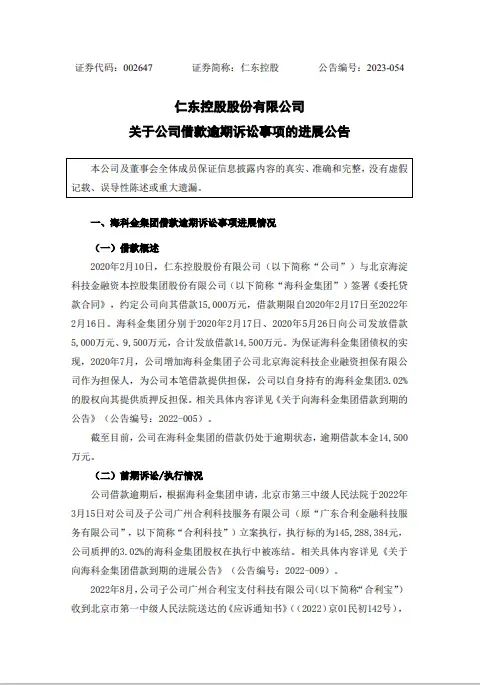 近日,合利宝母公司“仁东控股”发布了一则《关于公司借款逾期诉讼事项的进展公告》,具体如下: