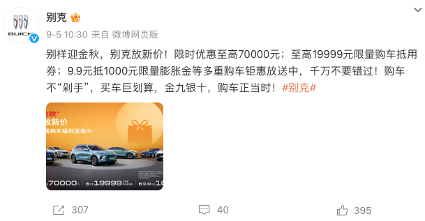 除了雪佛兰推出限时优惠外,9月5日,上汽通用别克也推出秋季购车限时优惠政策,优惠涉及车型包括威朗Pro、新款君威、新君越、昂科威家族、昂科旗、E4、E5和微蓝6 430公里版,限时优惠活动时间为即日起至2023年9月30日,其中,威朗Pro起售价从12.89万起降至7.89万元起,限时优惠5万元,并可享0首付0利率0月供等金融方案;新款君威起售价从15.98万元降至12.98万元,降幅为3万元;新君越起售价为17.99万元,限时综合优惠2万元;昂科威家族限时优惠6万元,并且昂科威Plus可额外享受4000元置换补贴;昂科旗限时优惠7万元。