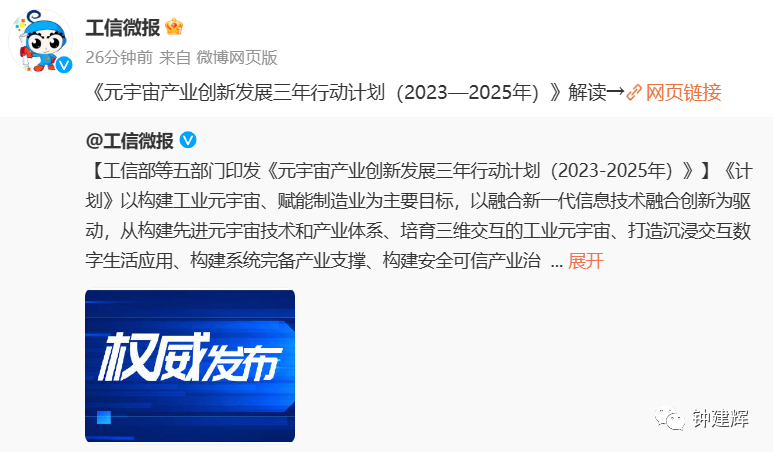 近日,工业和信息化部、教育部、文化和旅游部、国务院国资委、国家广播电视总局办公厅联合印发《元宇宙产业创新发展三年行动计划(2023-2025年)》,全文如下: