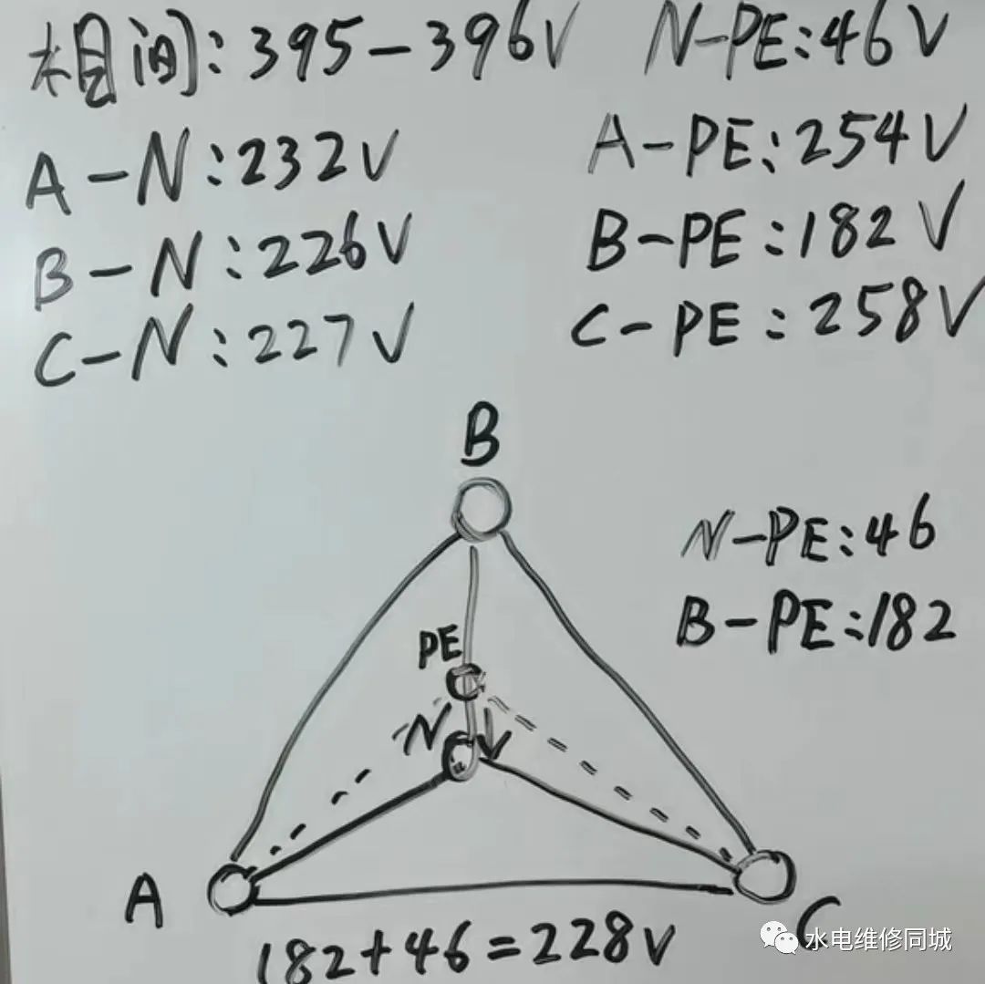 我们先画A项。A相与地线之间的电压。注意看图,是不是比正常的电压要高很多,和我们测出来的数据是不是相符的。接着再来画C相。C相与地线之间的电压。是不是也是同样的,比正常电压要高很多?最后,我们再来考虑零地之间的电压。零地之间的电压就是零位与地位之间的电压。我们测出来的数据是46伏。再结合带入B相与地线之间的电压数据是182V。182V再加46V等于228V,228V这个电压是不是就和相线与零线之间的电压差不多了?因为地电位和零电位本来就应该是等电位的,地电位本来也该在零电位的位置。现在从这张图上来看,地电位就升高了。因为B相的漏电造成了地电位升压了,同时B相与地线之间的电压降低,是因为B相与地的电位被拉近了,所以电比测出的零线带电实际上并不是真正的零线带电,而是地位升压带电。