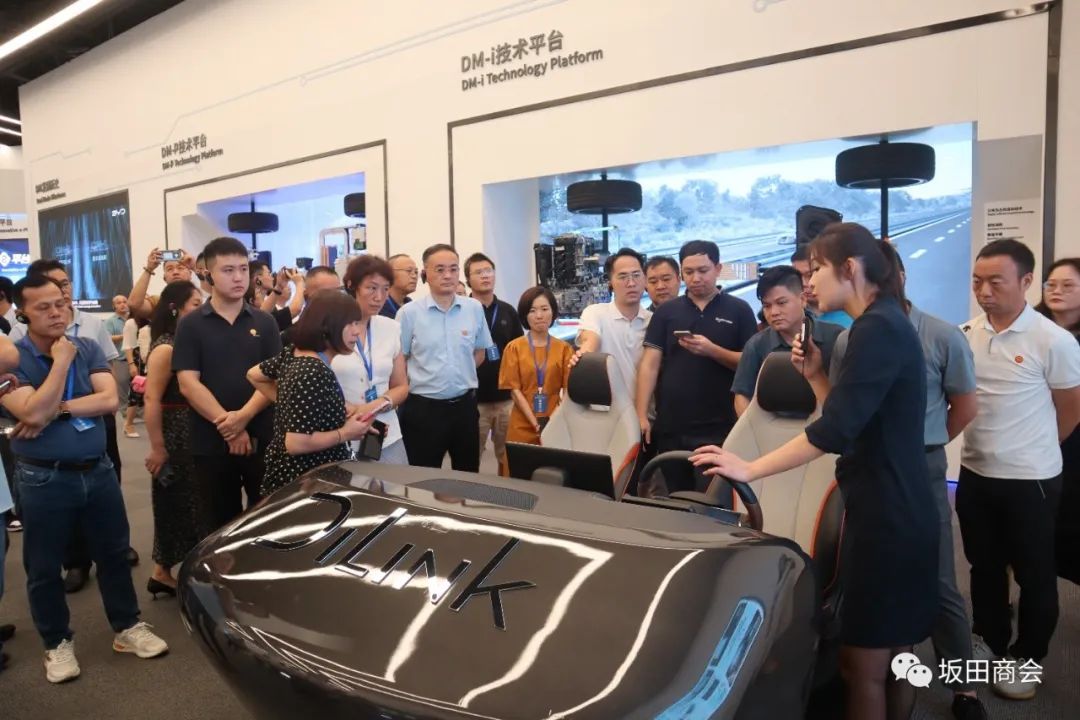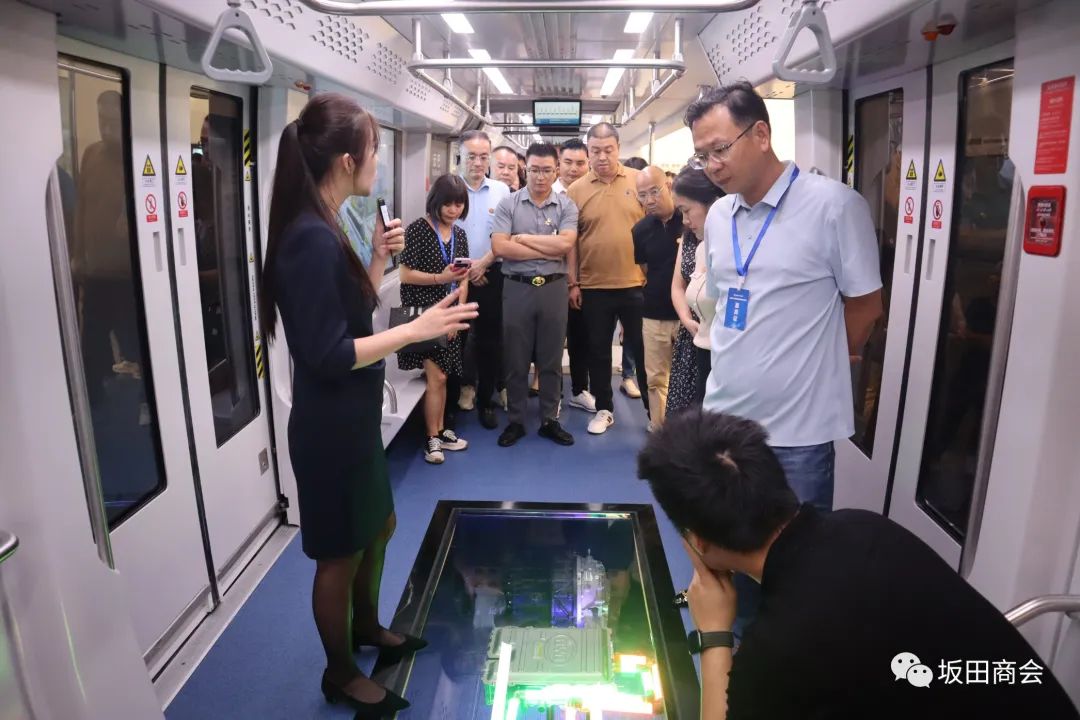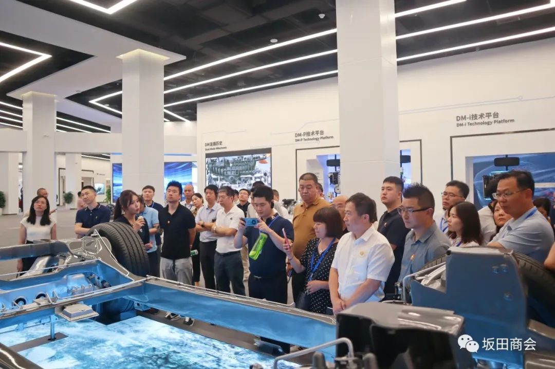 在比亚迪专业讲解员的全程陪同下,商会企业家们参观了比亚迪展厅,详细了解比亚迪的发展历程、业务布局、技术创新、科技慈善、各车型介绍等情况。展厅内,一张张鲜活的图片、一组组亮眼的数据、一件件簇新的展品,全面展现了比亚迪近三十年的发展历程和取得的骄人成绩。无论是全世界最大的专利墙,还是代表国际尖端水平的研发新品,都令人眼前一亮、为之振奋。随后,还体验了比亚迪园区的“云巴”。“云巴”是比亚迪绿色大交通解决方案的重要一环,可以解决城市地铁、轻轨覆盖空白等问题。