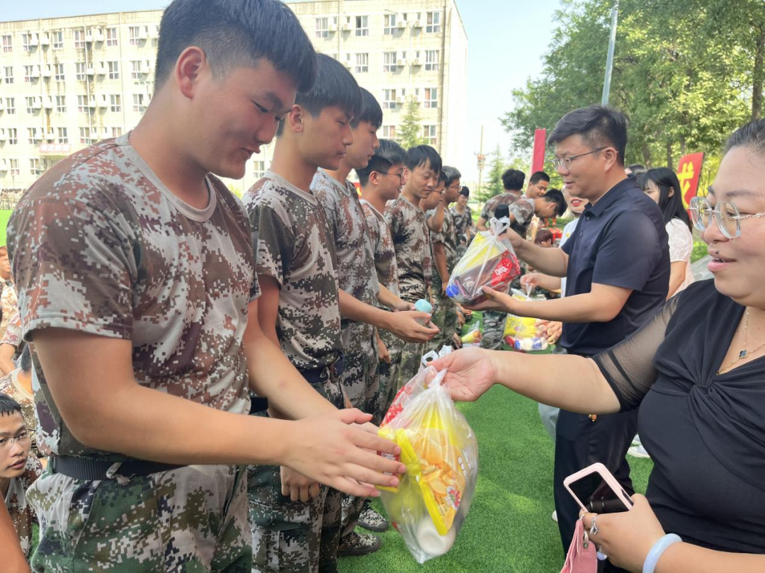 在训练场,武文斌书记对于参训学生所展现出的良好精神面貌给予了肯定,同时向各位同学们表达最诚挚的慰问和支持。他鼓励大家在接下来的军训任务中,要继续保持昂扬向上的积极态度,发挥吃苦耐劳的精神,要有组织观念和团队观念,将军训中收获的体会与感受带入到接下来的大学学习生活之中。同时,由各位领导和学工办的老师们向我院学生发放慰问品,对他们表示亲切的慰问。