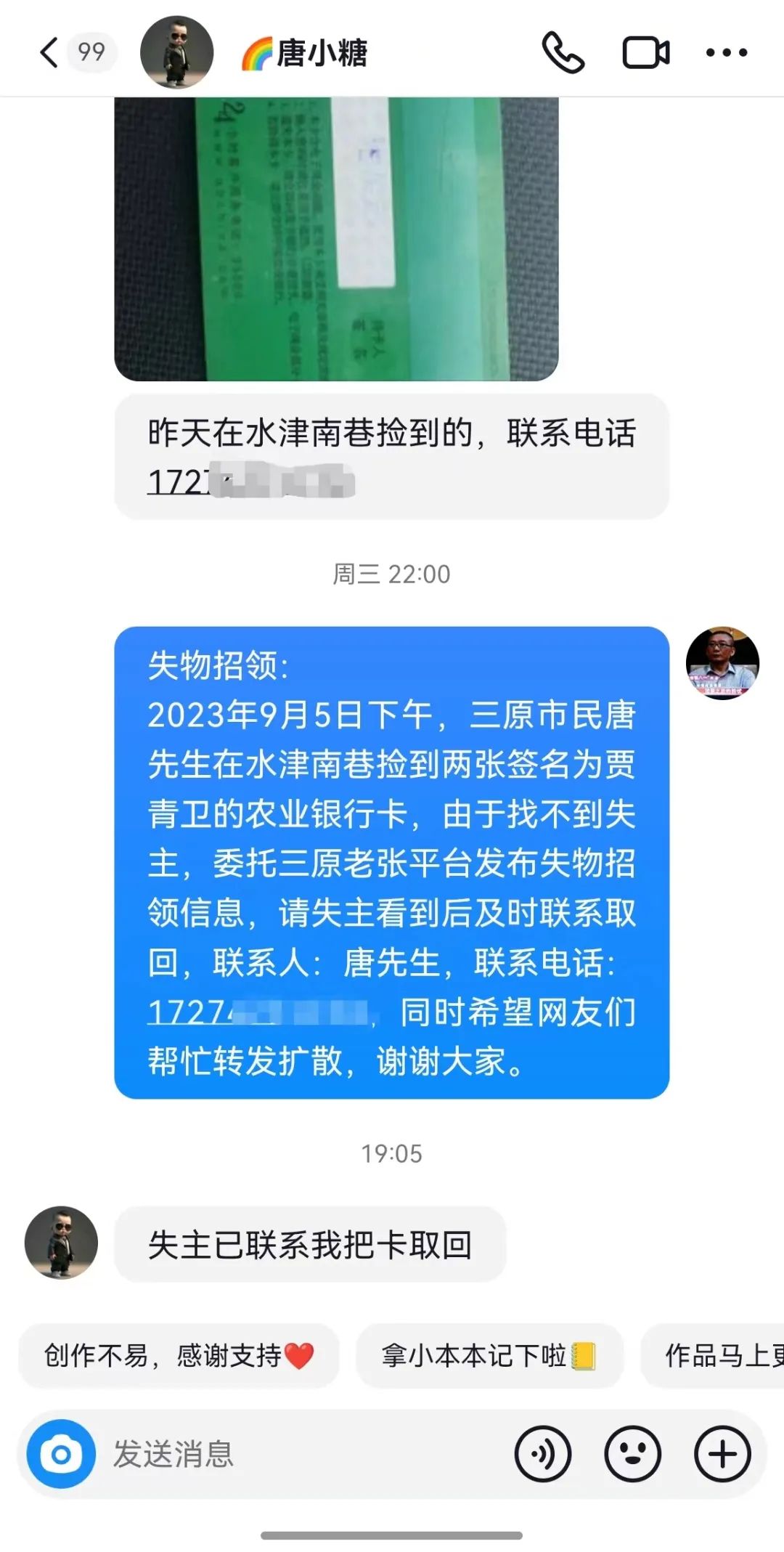 一、三原老张微信公众平台网友 @唐小糖 回复自己在水津南巷捡到的两张农行卡,委托三原老张平台发布失物招领信息后,失主已联系并把卡取回了。
