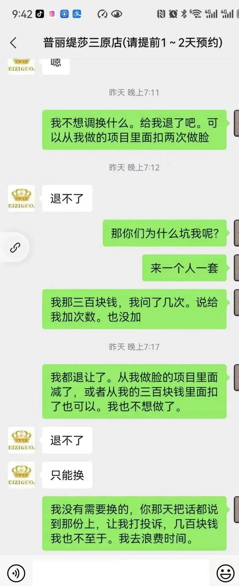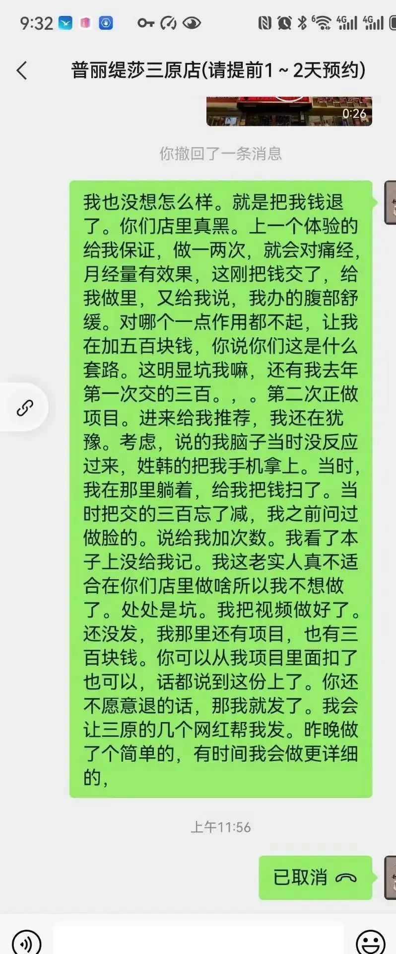 八、三原老张微信公众平台网友 @小熊猫 反映三原的女同胞们注意了,商贸一楼有个普丽缇莎美容院,她们的员工在大门口发卡片儿,让女同胞去店里免费领东西。结果进去后给一顿套路,各种推销洗脑,先让你办卡,办完卡后她们马上会让你签字,签的竟然是不退不换的字。人还没消费呢,第一次做项目时,做的人又说办的这个项目没效果,让你加钱做另外一种项目,这时你就会感觉被坑了。然后你再想退钱时,她们就不给退。目前自己已经给12345和12315打电话投诉了,也希望大家都分享转发一下,告诫三原的姐妹不要踩坑。