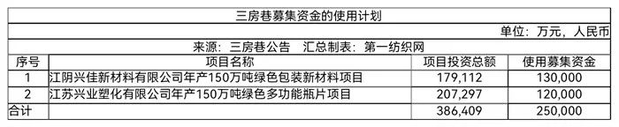 公告显示,三房巷此次公开发行可转换公司债券扣除发行费用后,计划投资于江阴兴佳新材料有限公司年产150万吨绿色包 装新材料项目和江苏兴业塑化有限公司年产150万吨绿色多功能瓶片项目。