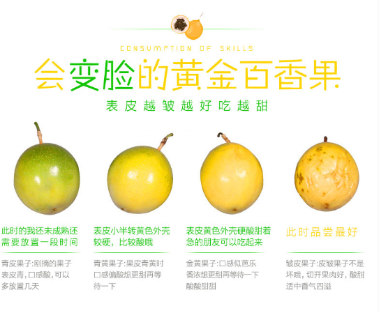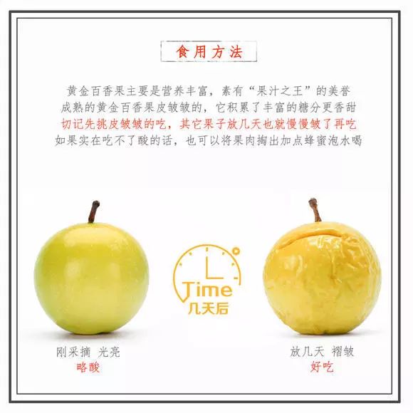 经常吃百香果的小伙伴都知道,刚收到时表皮是光滑的,此时直接吃会有点偏酸,想吃甜的,就等皮皱起来,干巴巴时再吃,皮虽皱但里面却刚好熟透,此时甜度已达到很高,可直接食用。