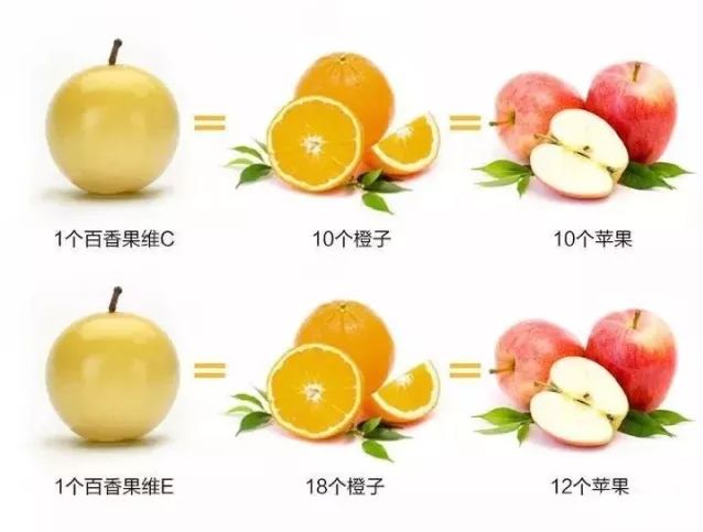 VC与VE是所有已知水果中含量巨高的,一个黄金百香果相当于8个火龙果,12个苹果,9个柠檬的营养量,更是橙子和苹果的10倍之多。