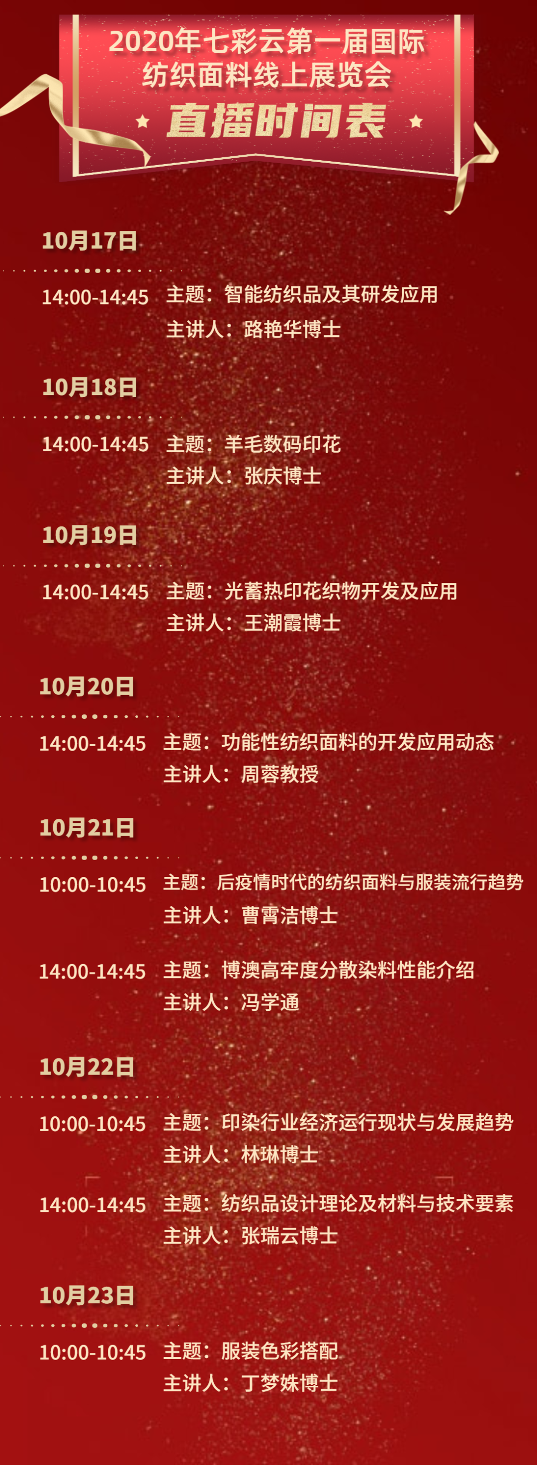 2020年10月17日上午11点,2020七彩云第一届国际纺织面料线上展览会盛大开幕!本次线上展览会特别邀请到中国印染行业协会会长陈志华先生;东华大学纺织学院院长顾伯洪先生;福建教育装备协会常务副会长、石狮市儿童产业联合会会长吴清湖先生为展览会致辞。同时,上海七彩云电子商务有限公司董事长徐长进先生也为展览会致欢迎辞。