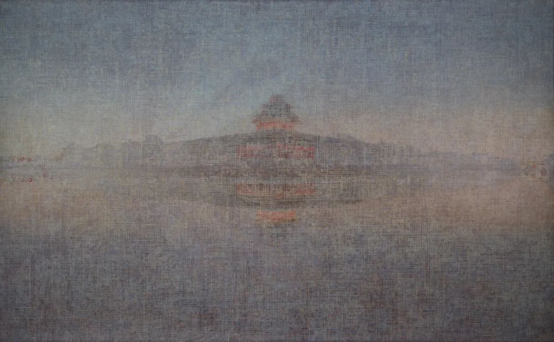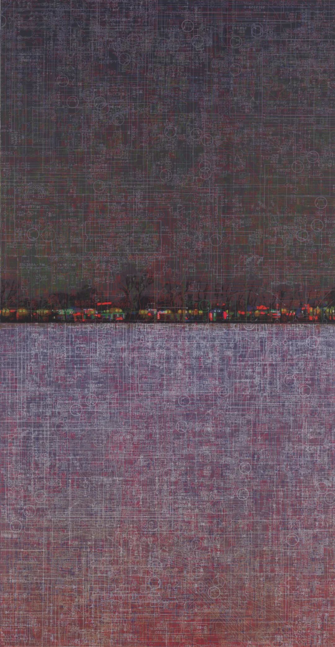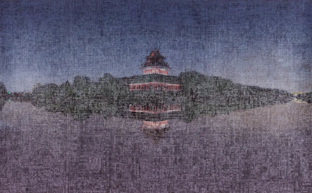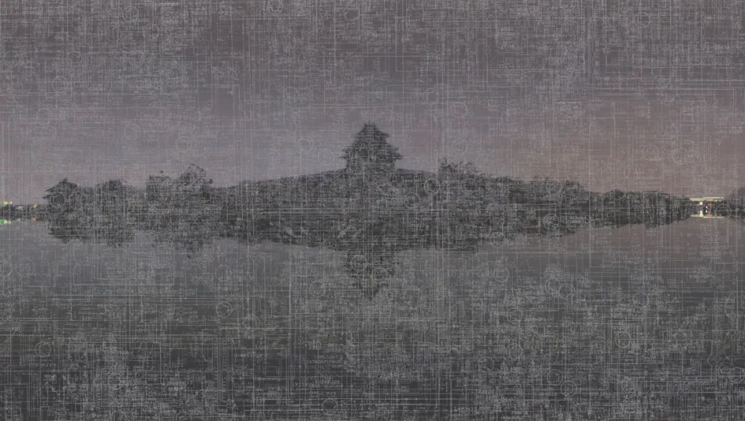 电路板——现代工业的象征——在所有选定的作品中反复出现。文中言使用他第一台电视机的说明书中的电路板图表作为这种图案的来源,还使用了一张1950年的老北京城区地图,那时老城的一些部分和城墙还未被拆除。经过不断的叠加,交叉的网格产生了迷幻的干扰效果,编织出一个五彩斑斓的几乎密不透风网络,明显遮挡了下方的古典建筑风景,同时在审美和象征上又阐明了其细节。