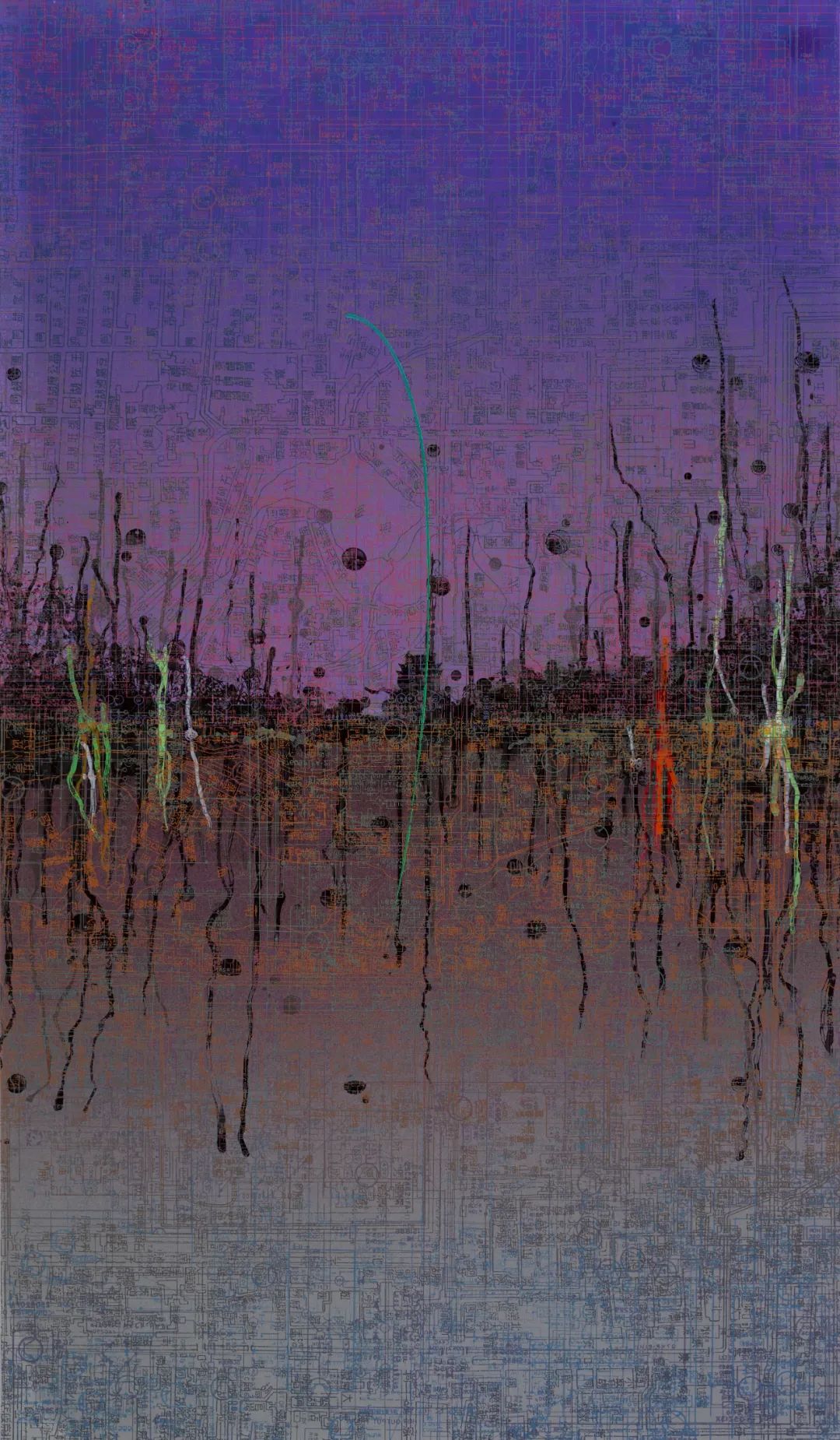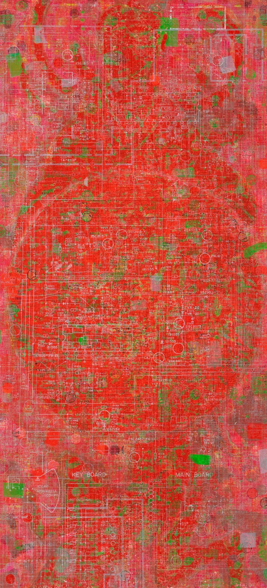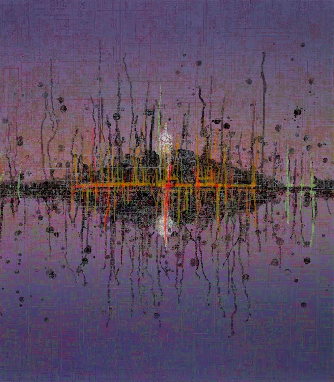 电路板——现代工业的象征——在所有选定的作品中反复出现。文中言使用他第一台电视机的说明书中的电路板图表作为这种图案的来源,还使用了一张1950年的老北京城区地图,那时老城的一些部分和城墙还未被拆除。经过不断的叠加,交叉的网格产生了迷幻的干扰效果,编织出一个五彩斑斓的几乎密不透风网络,明显遮挡了下方的古典建筑风景,同时在审美和象征上又阐明了其细节。