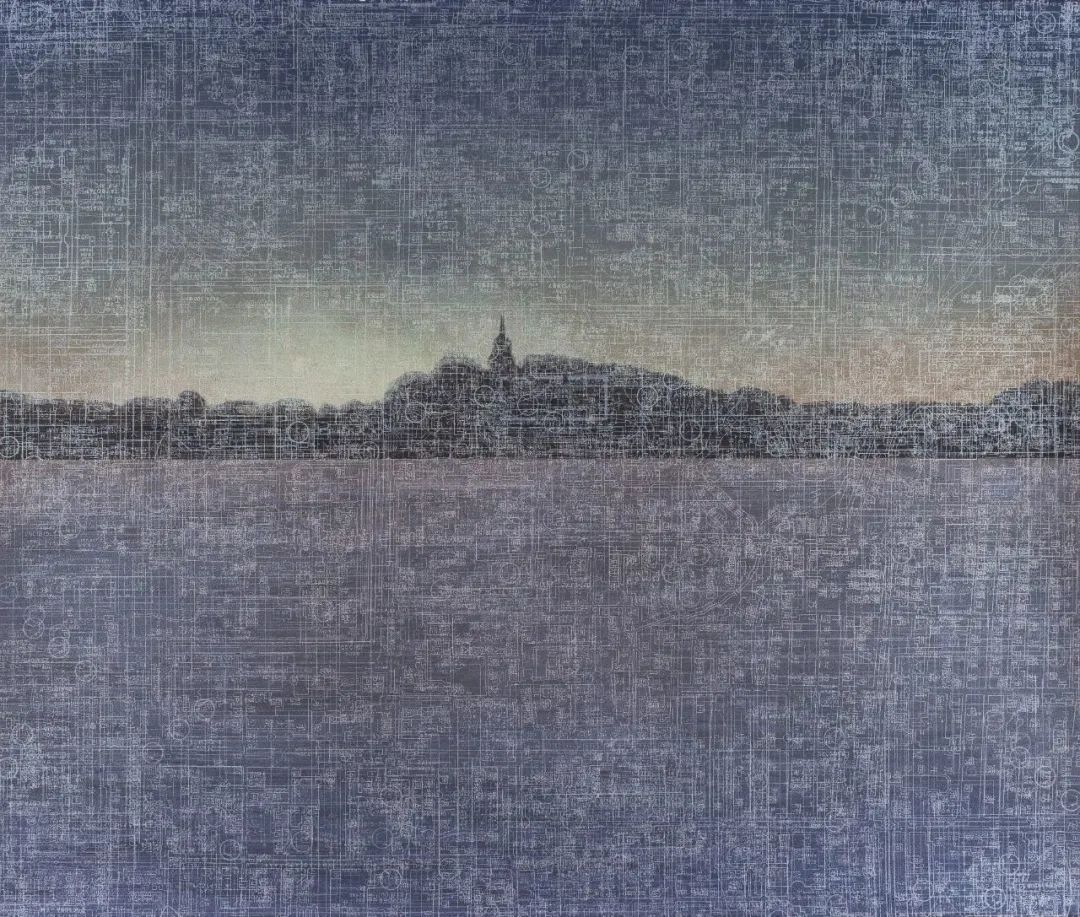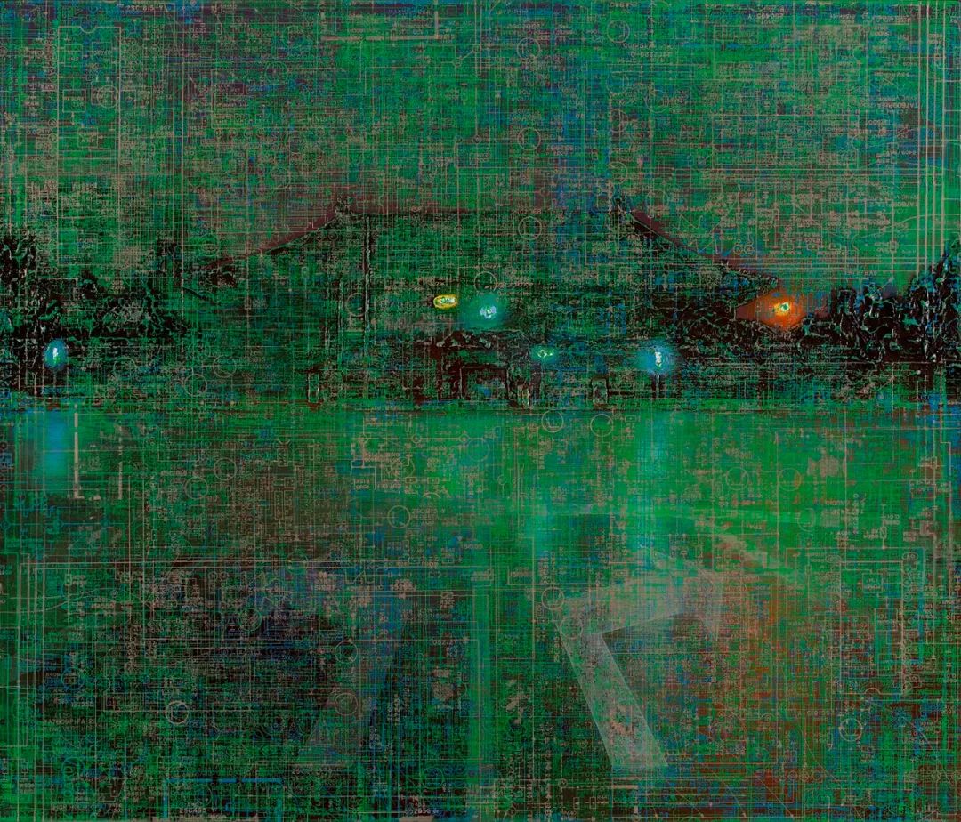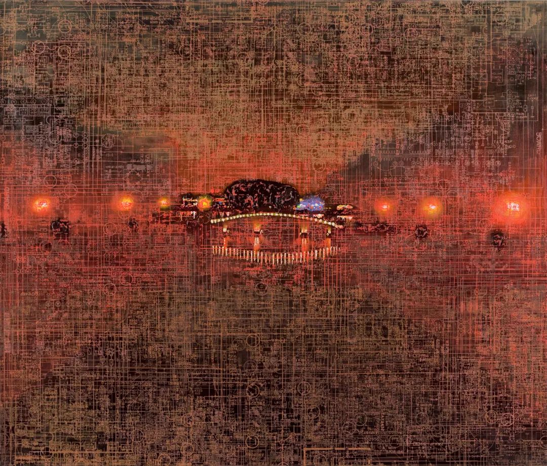 在夜晚强烈的人工照明下,城市的独特建筑成为文中言丝网印刷的电路板图和地图的背景。第一层图像是根据艺术家自己的照片绘制的,这些照片是他住在北京后海的夜晚拍摄的,漫步在充满传奇色彩的街道上,在夜色的掩护下,怀旧的感觉油然而生。