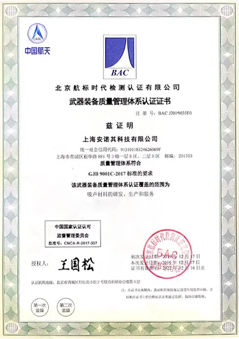 获得本次武器装备质量管理体系认证及相关军工资质后,安诺其科技公司将正式成为军工装备制造单位吸声材料核心供应商。