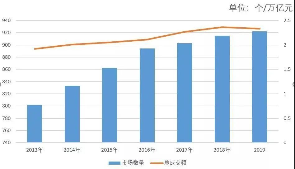 图表1 2013-2019年纺织服装专业市场总量规模逐年对比表
