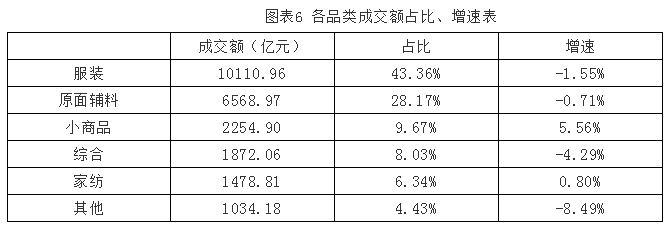 从品类看,服装和原、面(辅)料是我国纺织服装专业市场的主营商品,主营服装和原、面(辅)料的专业市场共653家,占市场总量的70.82%,成交额占总成交额的71.53%。其中,主营服装产品的专业市场491家,在各品类中成交额最高,达10110.96亿元,占总成交额的43.36%,同比下降1.55%;主营原、面(辅)料的专业市场162家,成交额位列第二,达6568.97亿元,占比28.17%,同比下降0.71%;仅主营小商品和家纺的专业市场实现了成交额的增长,其中,主营小商品的专业市场成交额增速最高,同比增长5.56%;家纺类专业市场运行基本平稳,增幅0.80%。