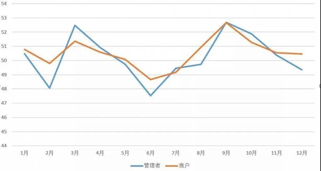 景气方面,2019年,纺织服装专业市场管理者景气与商户景气走势基本一致。春节假期过后在3月迎来上半年销售旺季,6、7月景气指数下滑,经过8月的调整,在9、10月迎来全年销售黄金期,11、12月回落;专业市场管理者景气指数全年平均值为50.22,同比下降1.83个百分点,商户景气指数全年平均值为50.52,同比下降0.30个百分点,两项平均数均超过50荣枯线,但相较2018年有所下滑。