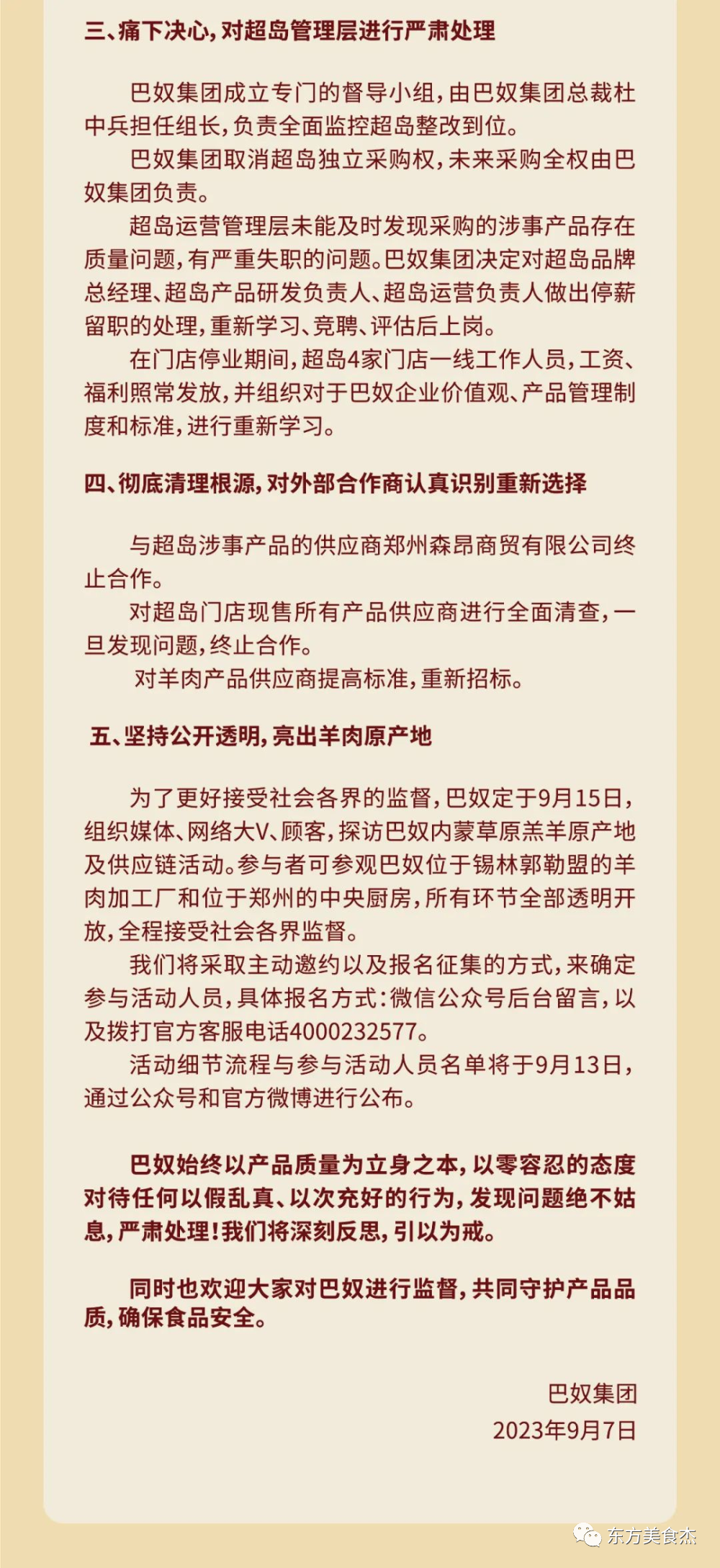 此外,巴奴还提到,与超岛涉事产品的供应商郑州森昂商贸有限公司终止合作。对超岛门店现售所有产品供应商进行全面清查,一旦发现问题,终止合作,并对羊肉产品供应商提高标准,重新招标。