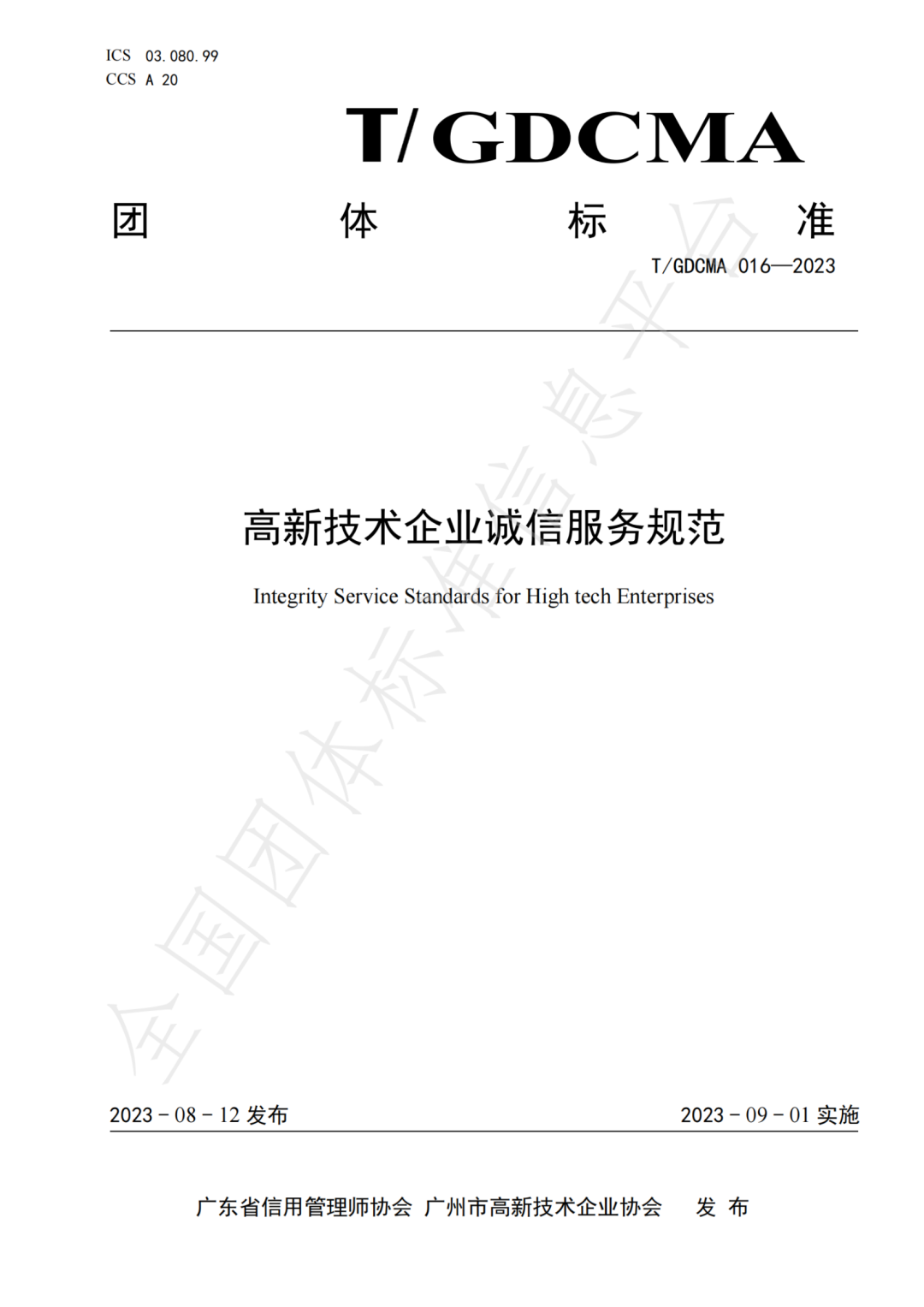 导读:2023年9月1日,由广州市高新技术企业协会负责组织编写,联合广州永华鸣骏科技咨询有限公司等35家单位共同参与起草的《T/GDCMA 016-2023高新技术企业诚信服务规范》,团体标准正式实施。这也是全国首个规范高新技术企业诚信服务的团体标准。